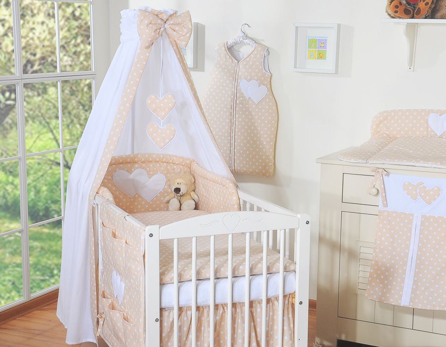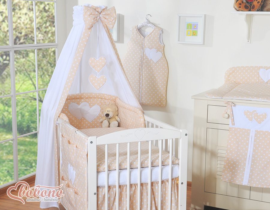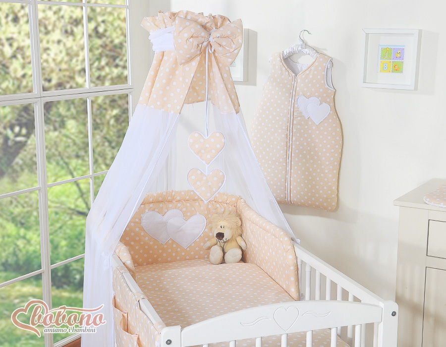 7-osainen vuodevaatesetti ja katosverho - Leijuvat Sydämet Beige Valkoisilla Pilkuilla