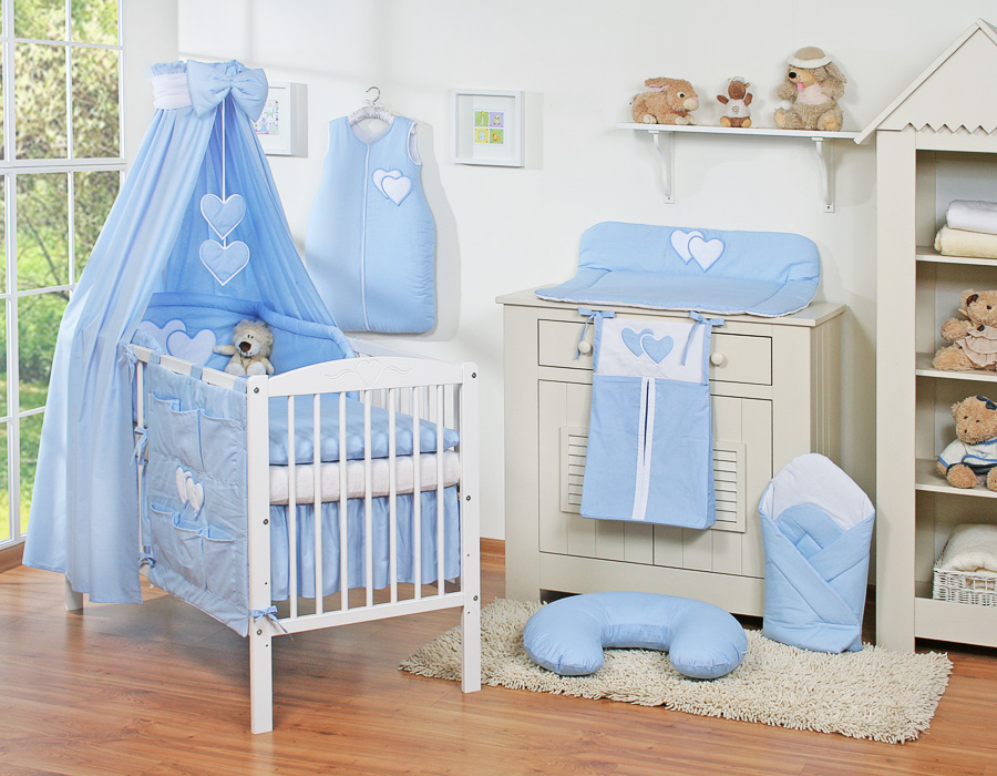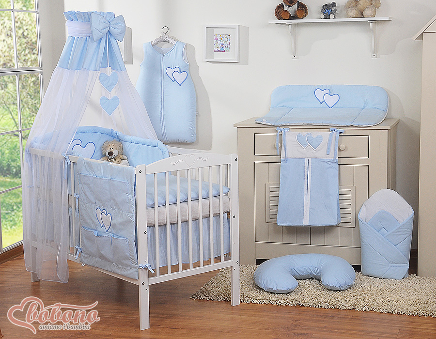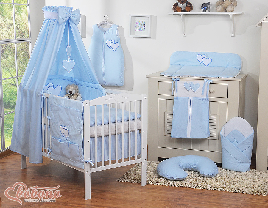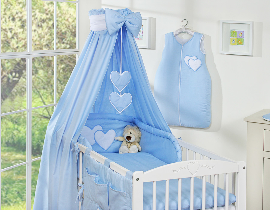 7-osainen vuodevaatesetti vauvalle + katosverho - Hanging Hearts