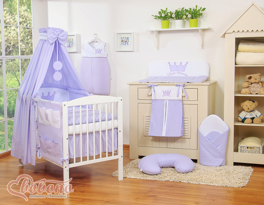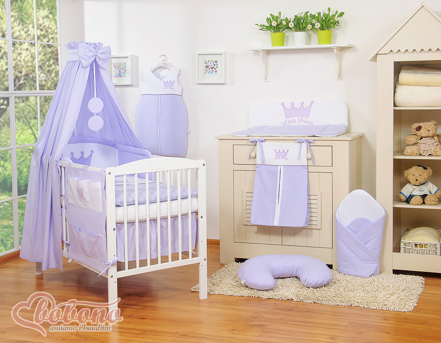Etusivu » Vuodevaatesetit pinnasänkyyn » Vuodevaatesetit Little Prince/Princess » Vuodevaatesetit pinnasänkyyn 120cm » 7-os Pussilakanasetti Verho Pinnasänkyyn » 7-osainen vuodevaatesetti ja katosverho - Little Prince / Princess Violetti