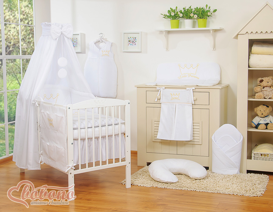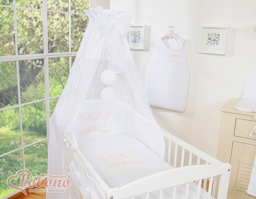 Etusivu » Vuodevaatesetit pinnasänkyyn » Vuodevaatesetit Little Prince/Princess » Vuodevaatesetit pinnasänkyyn 120cm » 7-os Pussilakanasetti Verho Pinnasänkyyn » 7-osainen vuodevaatesetti + katosverho - Little Prince / Princess Valkoinen