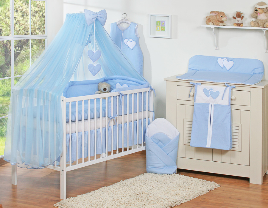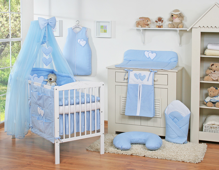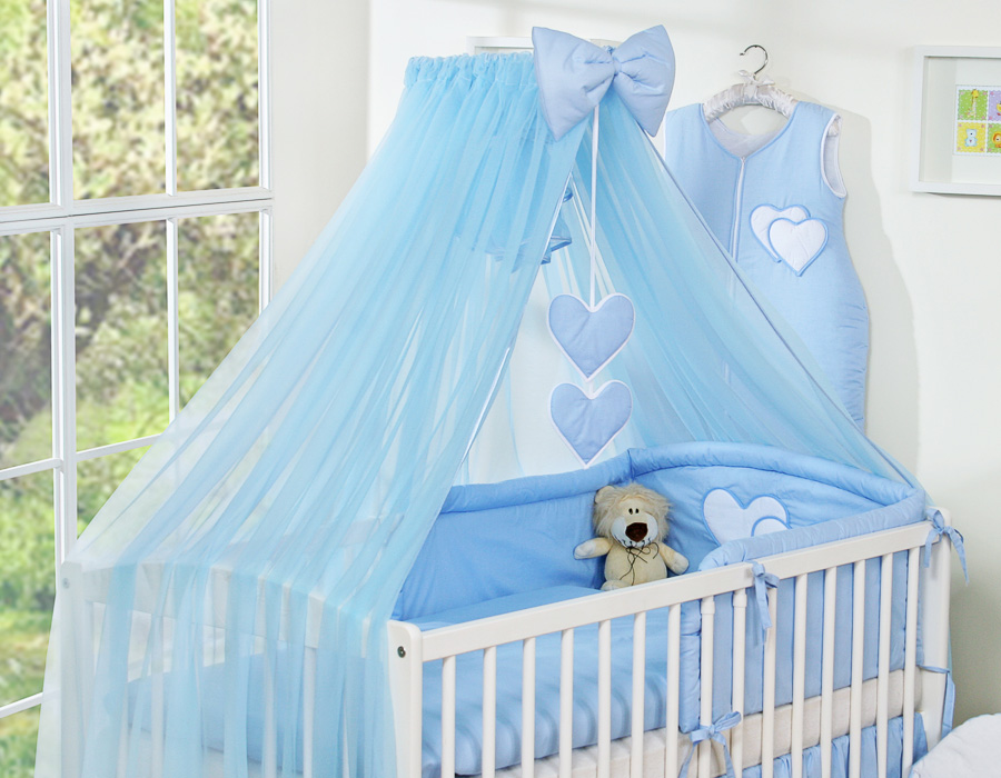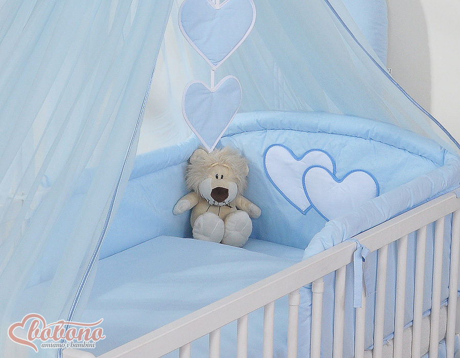 7-osainen vuodevaatesetti vauvalle + hyttysverkko - Hanging Hearts Sininen