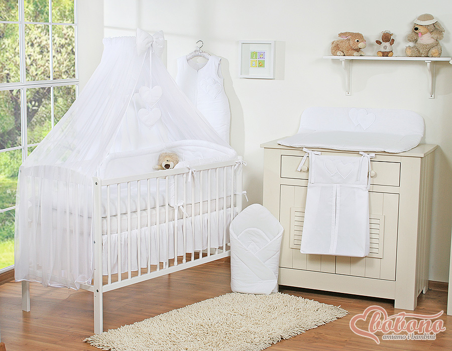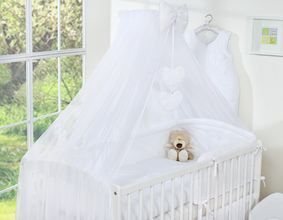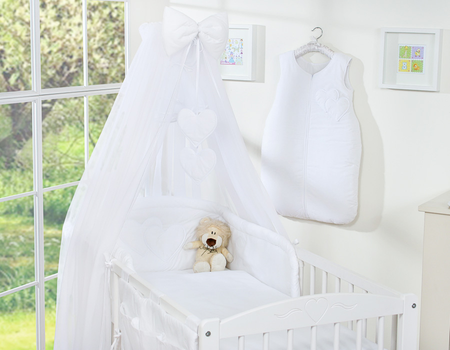 7-osainen vuodevaatesetti vauvalle + hyttysverkko - Hanging Hearts Valkoinen