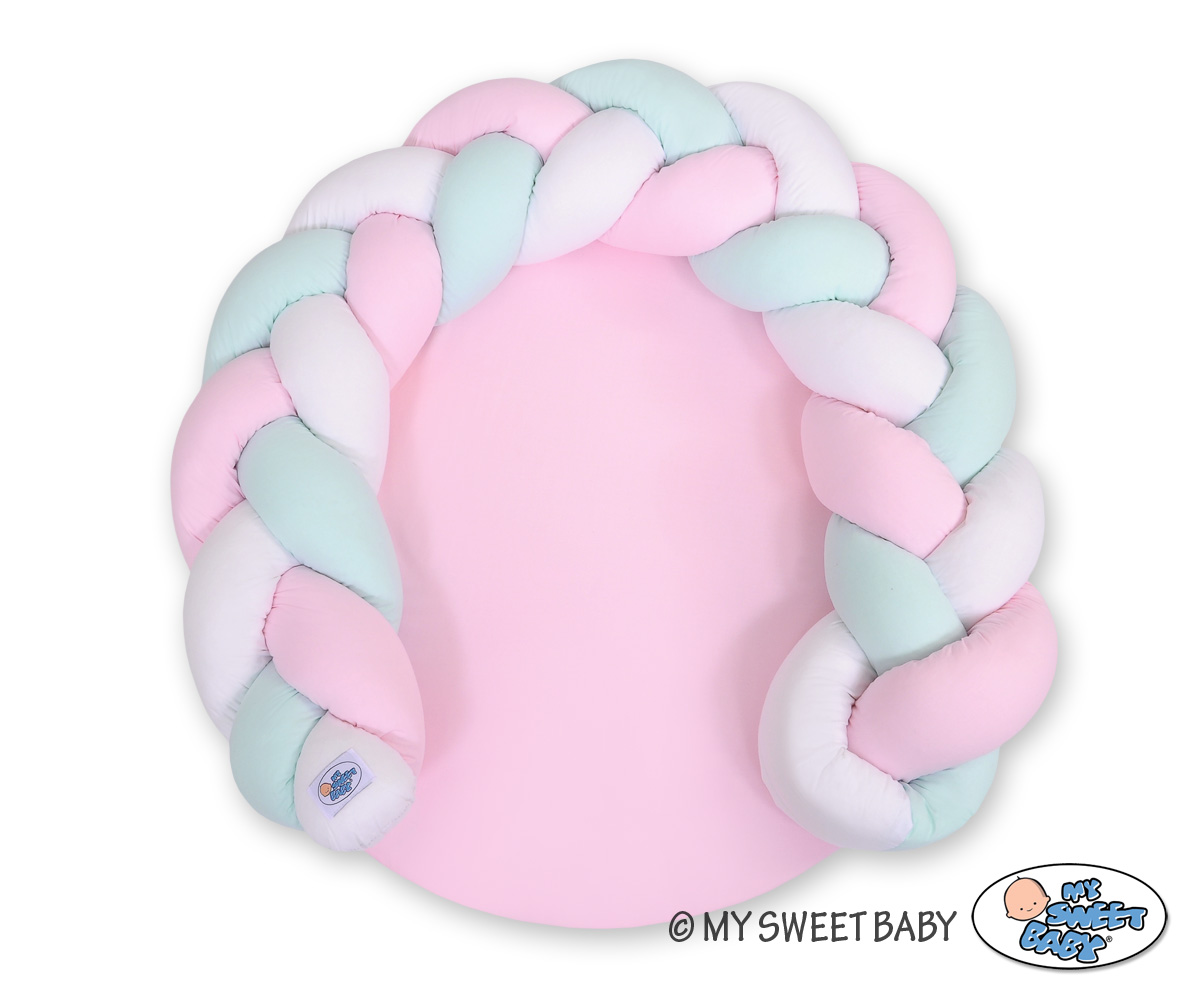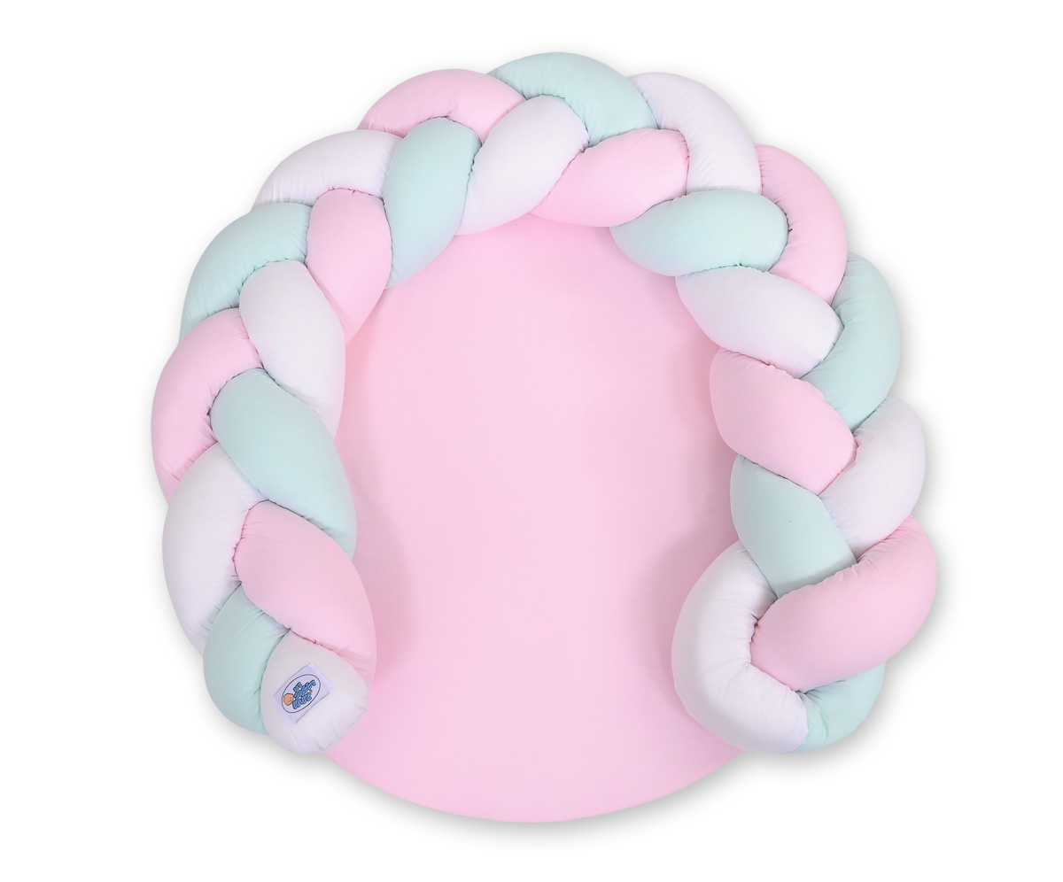 Monikäyttöinen letitetty donitsityyny vauvalle. Tyyny toimii kahdella tapaa; leikkimattona suojareunuksen kera tai sitten suojareunuksen saa irti ja liitettyä vauvan sänkyyn reunapehmusteeksi. Turvallinen leikkialusta vauvan ensihetkistä lähtien. Sopii vastasyntyneelle unipesäksi ja myöhemmin leikkialustaksi.
