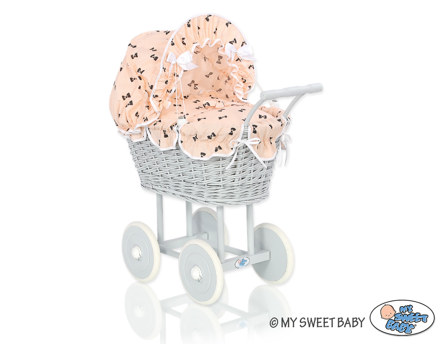 Etusivu » Lelut » Nukenvaunut » Punottu Nukenvaunut » Punottu Nukenvaunut Harmaa » Harmaa nuken vaunu punotulla korilla ja pehmusteilla Harmaa Rusetit