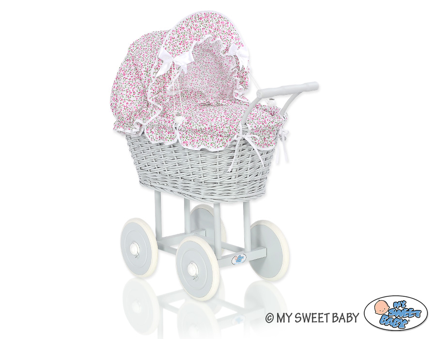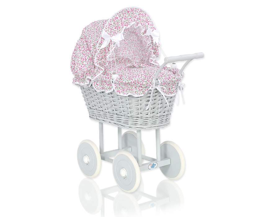 Etusivu » Lelut » Nukenvaunut » Punottu Nukenvaunut » Punottu Nukenvaunut Harmaa » Harmaa nuken vaunu punotulla korilla ja pehmusteilla Vaaleanpunainen Harmaa Kukkaketo Kukat