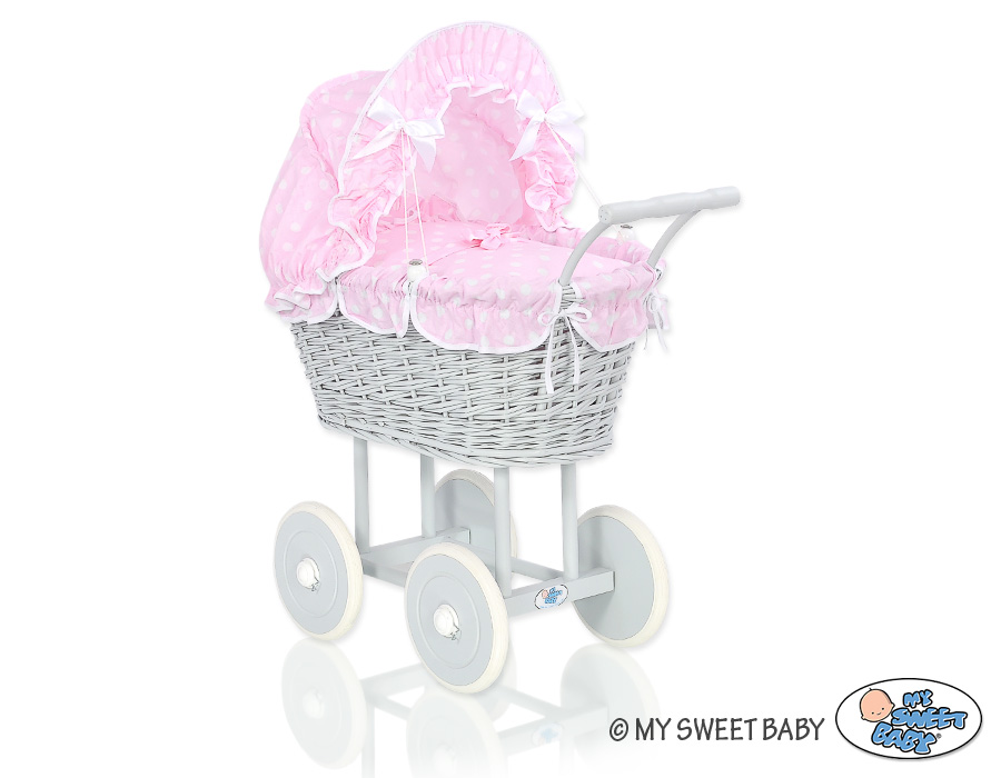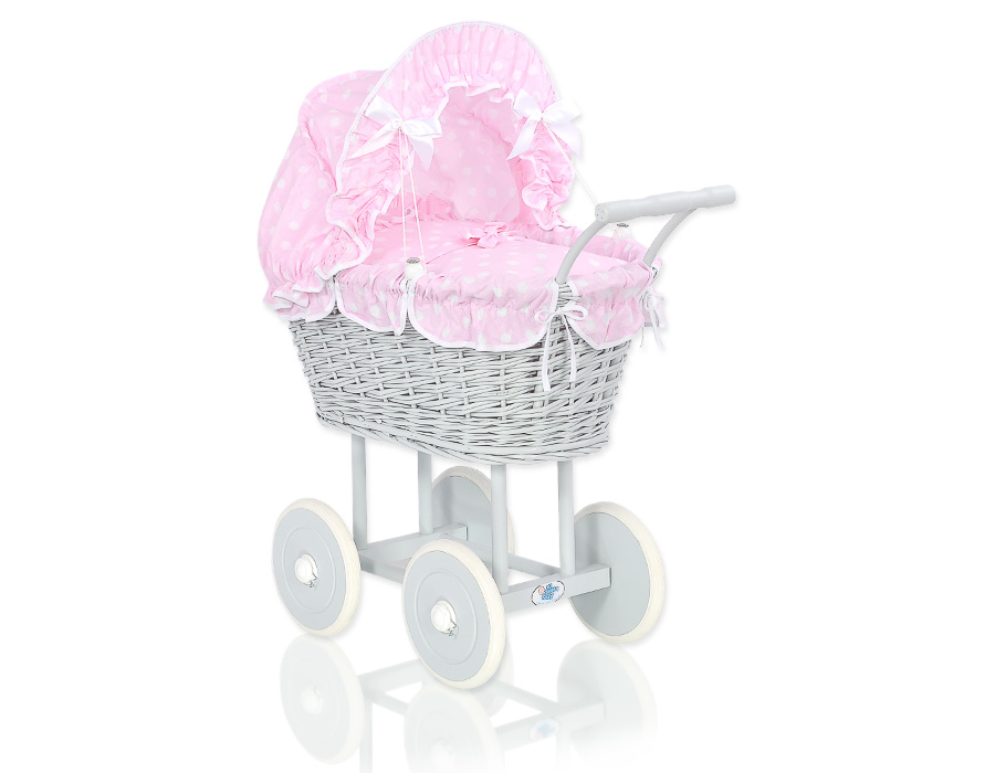 Harmaa nuken vaunu punotulla korilla ja pehmusteilla Vaaleanpunainen Harmaa