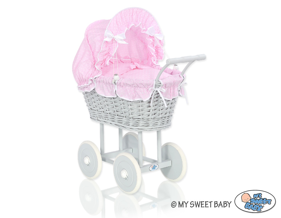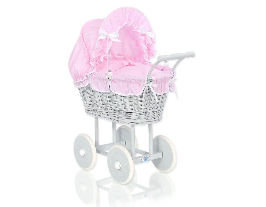Harmaa nuken vaunu punotulla korilla ja pehmusteilla Vaaleanpunainen Valkoinen Harmaa