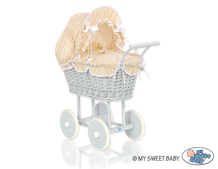 Harmaa nuken vaunu punotulla korilla ja pehmusteilla Valkoinen Harmaa Beige