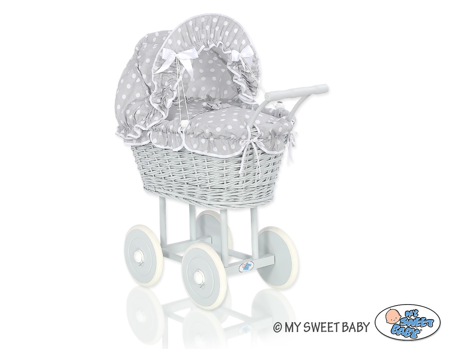 Harmaa vaunu punotulla korilla nukelle Valkoinen Harmaa