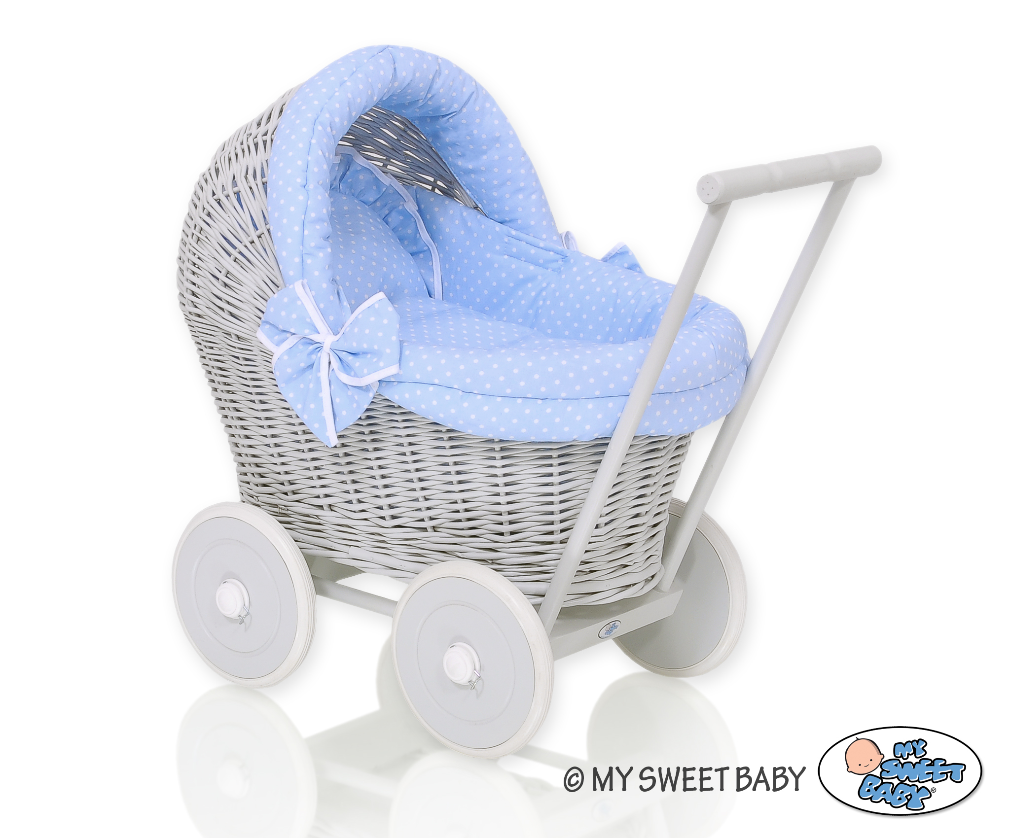 Etusivu » Lelut » Nukenvaunut » Punottu Nukenvaunut » Punottu Nukenvaunut Harmaa » Harmaa vaunu punotulla korilla nukelle Valkoinen Harmaa Sininen