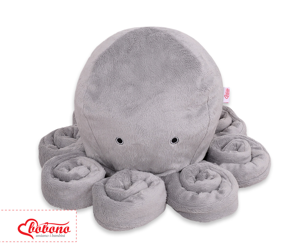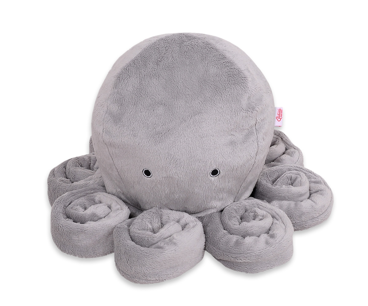 Tämä hupaisa ja halittava tyyny sopii kuin nakutettu jokaiselle vauvalle. Mustekalan lonkerot tuntuvat mukavilta vauvan pikkukätösissä. Tyyny on hauska ja turvallinen virike vauvan ensihetkistä lähtien. Hellä helistimen ääni kerää vauvan huomion itseensä. Pöyheä ja pehmeä tyyny on hellävaraista pörrö-fleeceä. Täyte on silikonista eko-palloa, eli kuin keinotekoista untuvaa. Muotoilu takaa vauvalle mukavan asettumisen sekä ilman kiertämisen.