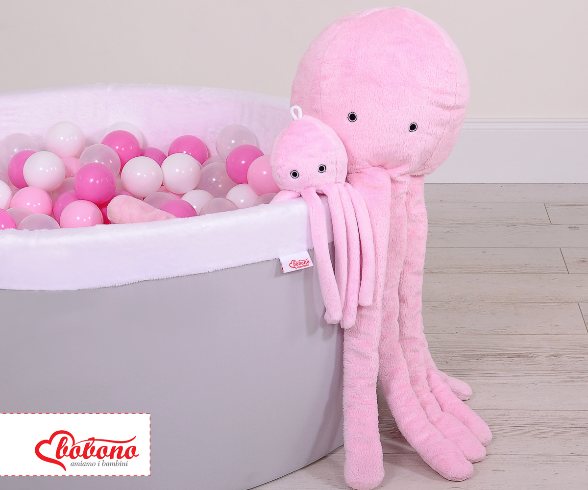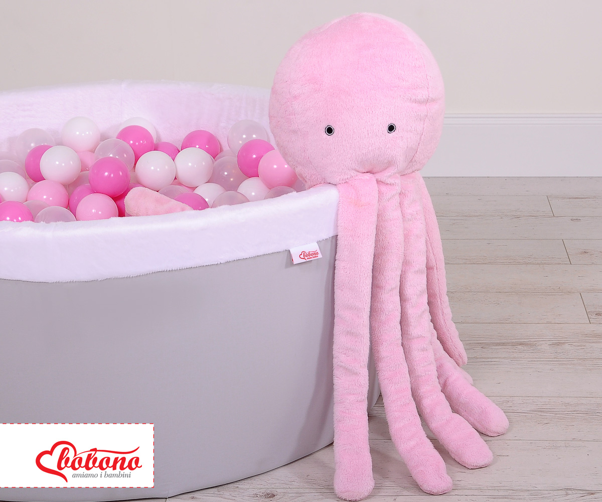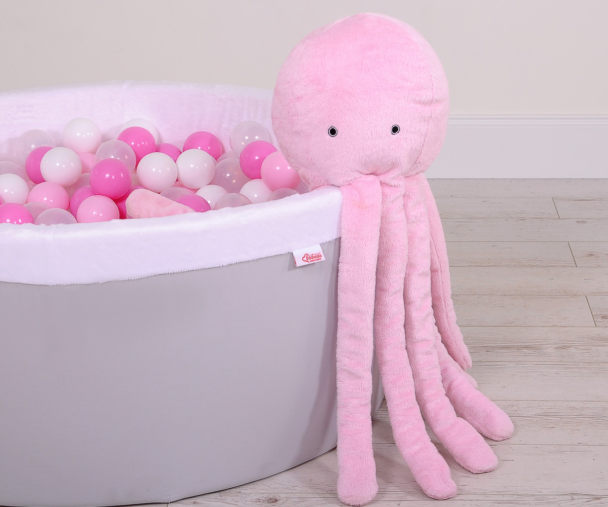 Tämä hupaisa ja halittava tyyny sopii kuin nakutettu jokaiselle vauvalle. Mustekalan lonkerot tuntuvat mukavilta vauvan pikkukätösissä. Tyyny on hauska ja turvallinen virike vauvan ensihetkistä lähtien. Hellä helistimen ääni kerää vauvan huomion itseensä. Pöyheä ja pehmeä tyyny on hellävaraista pörrö-fleeceä. Täyte on silikonista eko-palloa, eli kuin keinotekoista untuvaa. Muotoilu takaa vauvalle mukavan asettumisen sekä ilman kiertämisen.