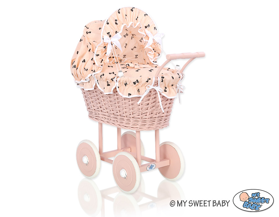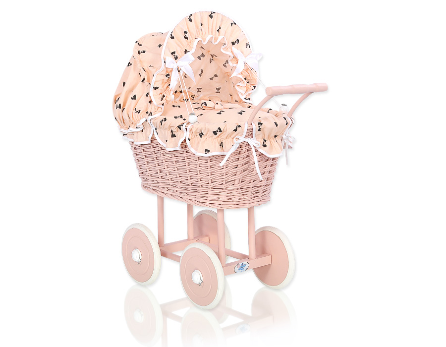 Etusivu » Lelut » Nukenvaunut » Punottu Nukenvaunut » Jauhe Vaaleanpunainen punottu nuken vaunu » Jauhe Vaaleanpunainen nuken vaunu punotulla korilla ja pehmusteilla Rusetit