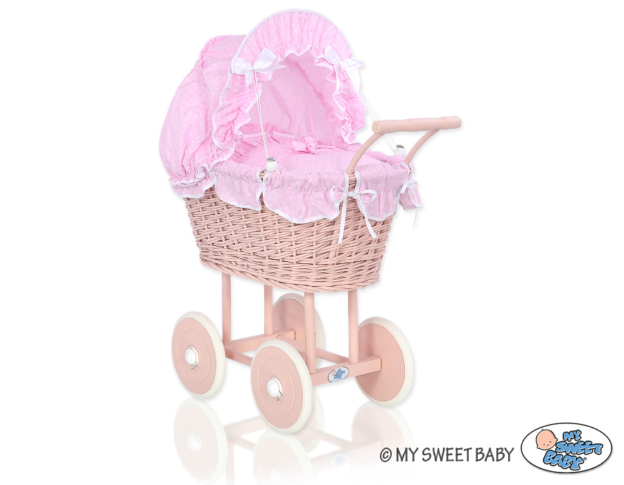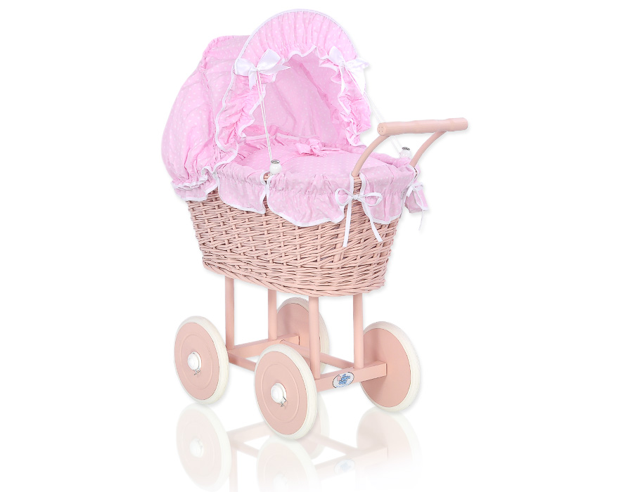 Jauhe Vaaleanpunainen nuken vaunu punotulla korilla ja pehmusteilla Vaaleanpunainen Valkoinen