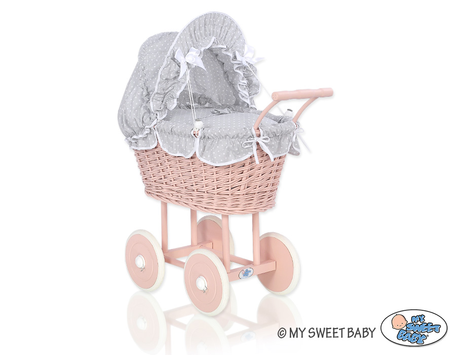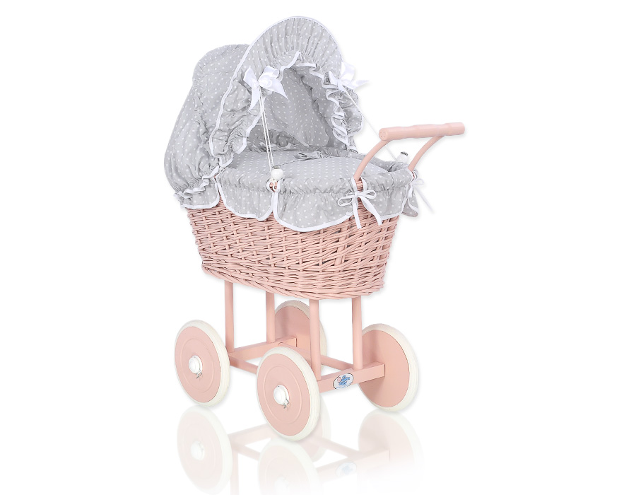 Jauhe Vaaleanpunainen punottu nuken vaunu korikehdolla Valkoinen Harmaa