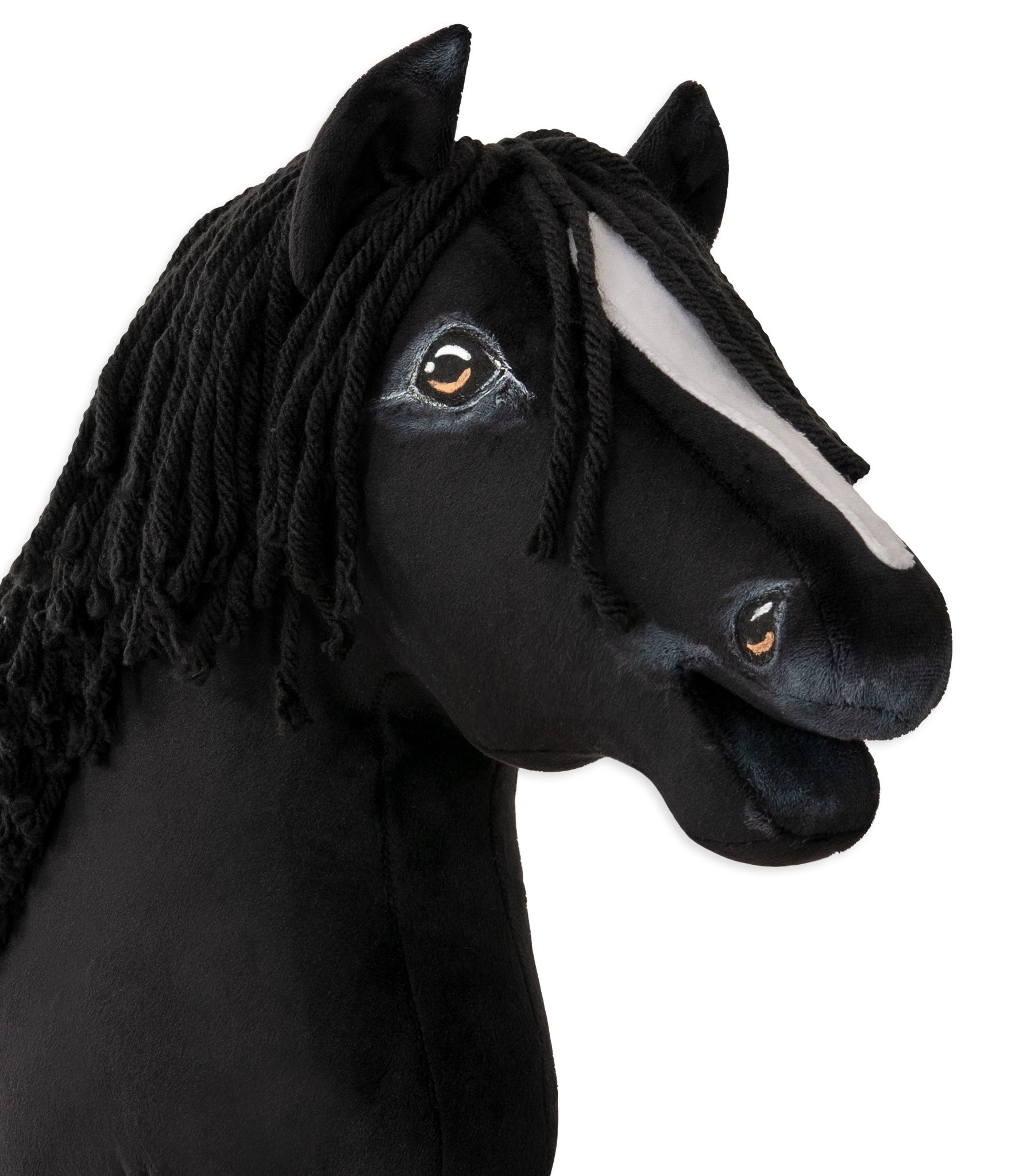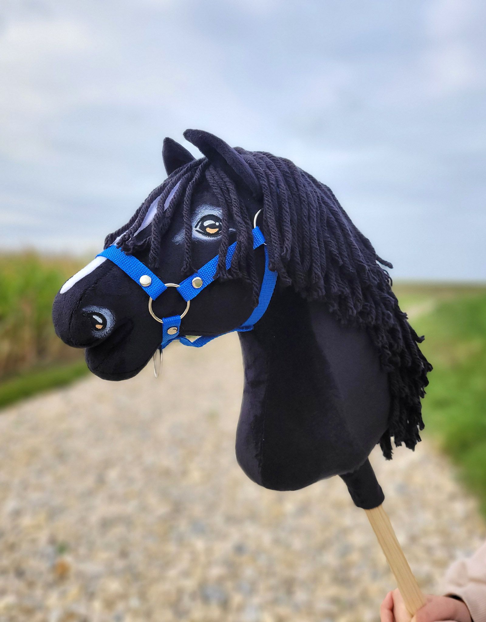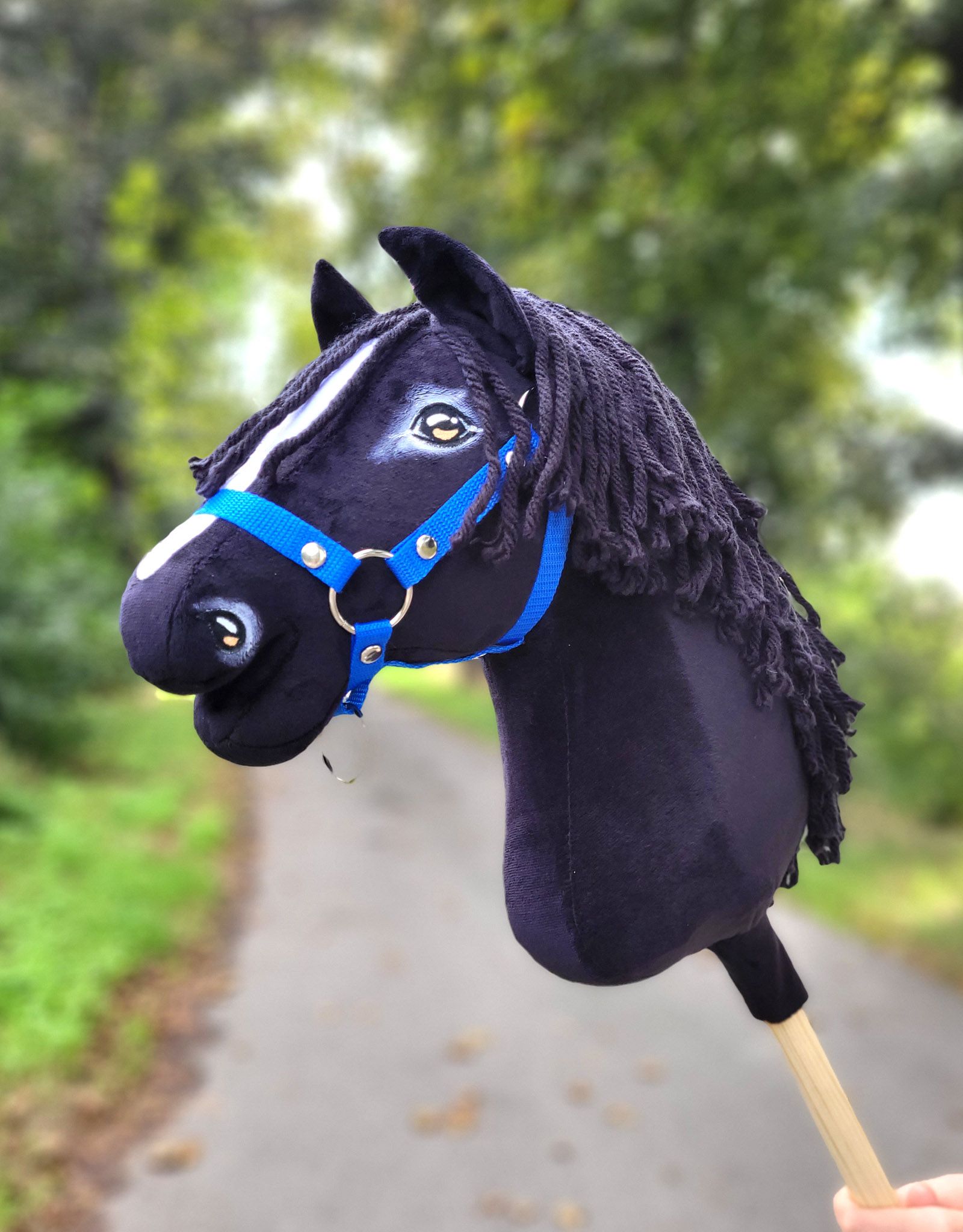 Tämä keppihevonen on ommeltu käsin, realistisesti muotoiltu ja yksityiskohdat on maalattu ja varjostettu käsityönä. Pään koko vastaa A3-kokoa. Kestävä sisärakenne tekee keppihevosesta vakaan ja helposti käsiteltävän – se ei väänny eikä huoju leikeissä.
