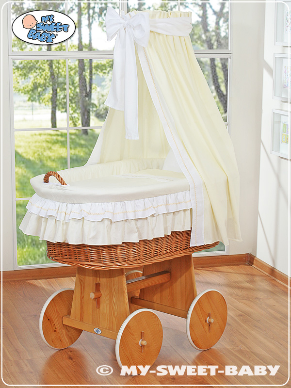 Kehdossa on kaunis ja autenttinen, tilava kori. Puuosat ja kori ihanan luonnollisen puun väriset.