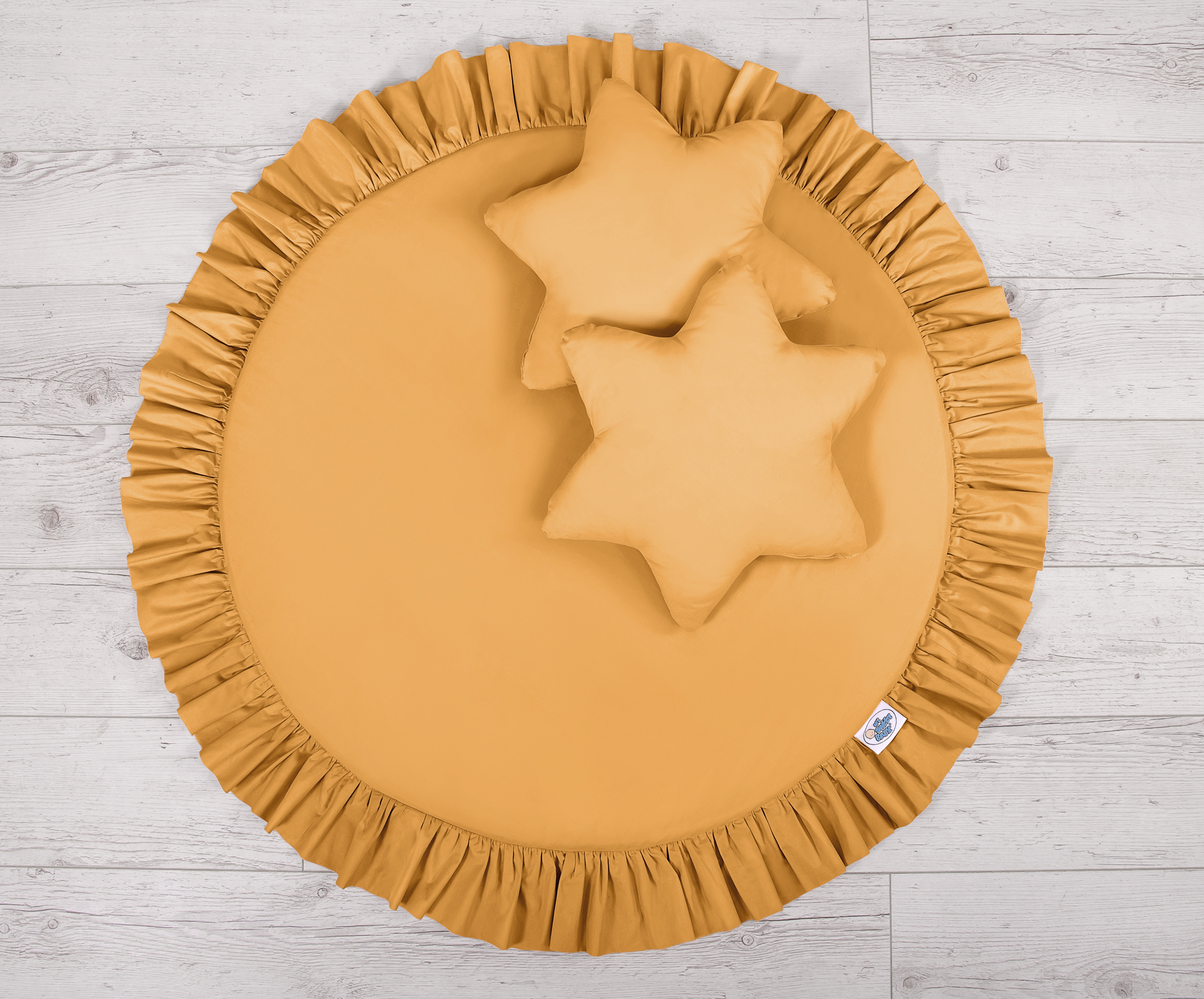Leikkimatto röyhelöreunuksella. Sopii käytettäväksi mattona, leikkimattona tai suuren prinsessakatoksen matoksi. Sopii vauvan ensihetkistä lähtien makuualustaksi, temmellysalustaksi vauvan harjoitellessa mahallaan oloa, tai muuten leikkimattona. Pehmeä täyte eristää täysin kylmän ja kovan lattian. Maton päällinen on 100% Okotex-sertifioitua puuvillaa. Matto on tehty anti-allergisista ja nykyaikaisista sertifioiduista materiaaleista. Päällyksen saa irti matusta pesua varten.
