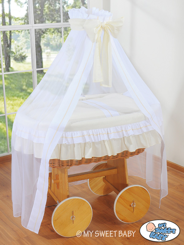 Etusivu » Vauvankori » Vauvan kori pyörillä ja katosverho » Vauvan kehto pyörillä » Liikuteltava vauvan kehto prinsessaverholla Norsunluu Bellamy