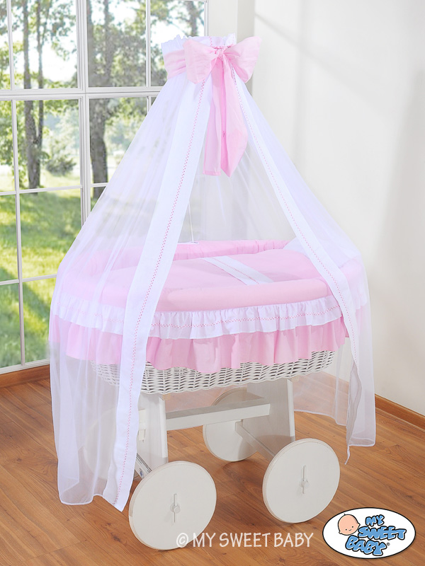 Punottu vauvan kehto on koristeltu romanttisella ja prinsessamaisella värikkäällä puuvillakankaalla ja valkoisella tyllillä koristeiden kera. Katosverho toimii myös hyttysverkkona.