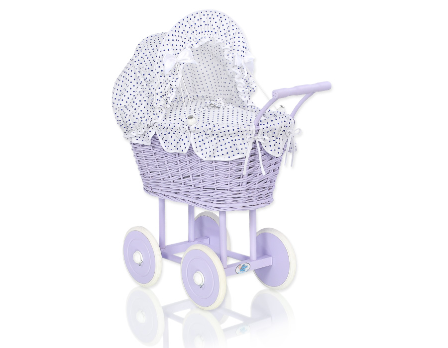 Etusivu » Lelut » Nukenvaunut » Punottu Nukenvaunut » Punottu Nukenvaunut Liila » Liila nuken vaunu punotulla korilla ja pehmusteilla Violetti Valkoinen Laivastonsininen Valkoisilla Pilkuilla