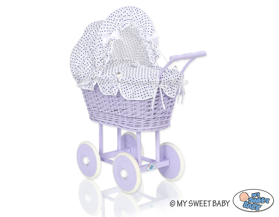 Liila nuken vaunu punotulla korilla ja pehmusteilla Violetti Valkoinen Laivastonsininen Valkoisilla Pilkuilla