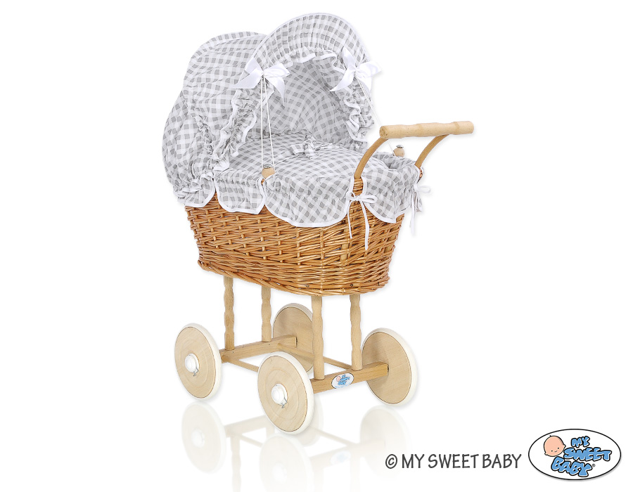 Etusivu » Lelut » Nukenvaunut » Punottu Nukenvaunut » Nukenvaunut koripunosta » Luonnollisen väriset nuken vaunut punotulla korilla ja pehmusteilla