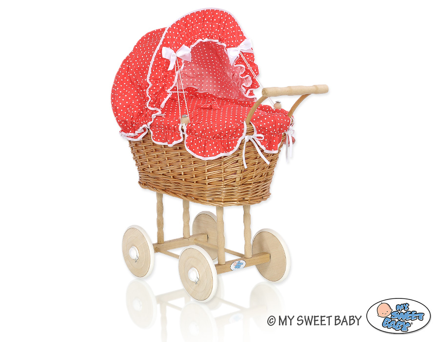 Etusivu » Lelut » Nukenvaunut » Punottu Nukenvaunut » Nukenvaunut koripunosta » Luonnollisen väriset nuken vaunut punotulla korilla ja pehmusteilla Punainen