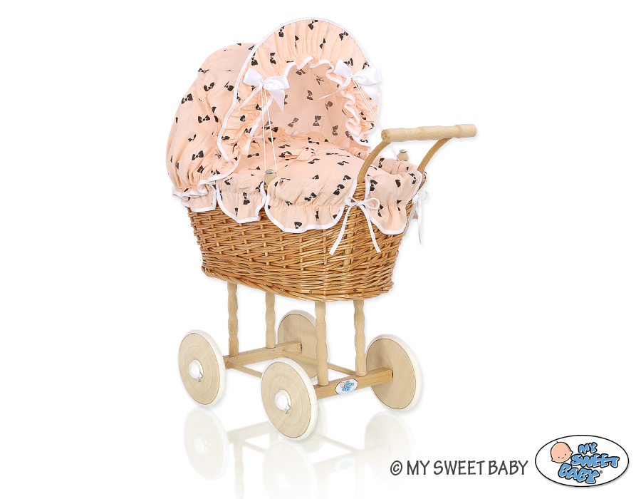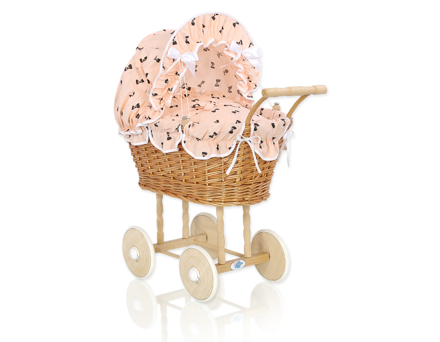 Luonnollisen väriset nuken vaunut punotulla korilla ja pehmusteilla Rusetit
