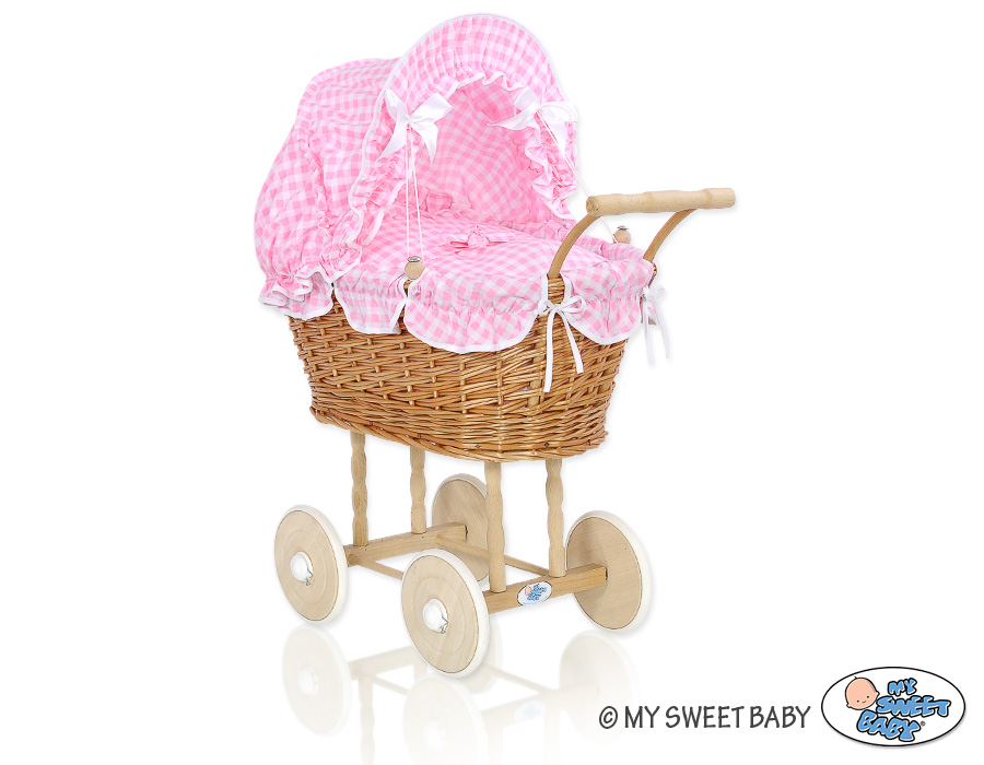 Luonnollisen väriset nuken vaunut punotulla korilla ja pehmusteilla Vaaleanpunainen Ruutukuvio