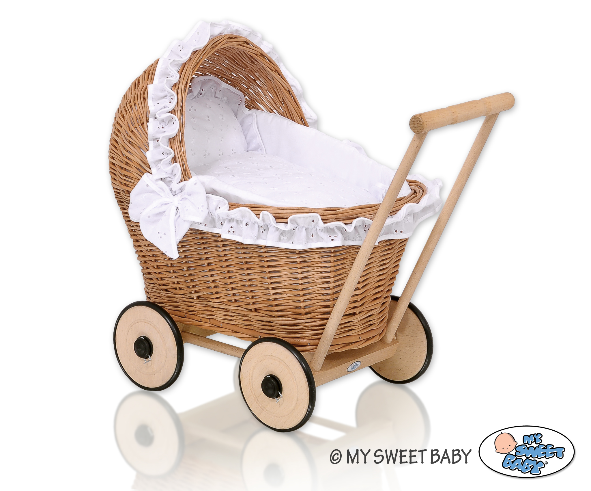 Luonnollisen väriset nuken vaunut punotulla korilla ja pehmusteilla Valkoinen