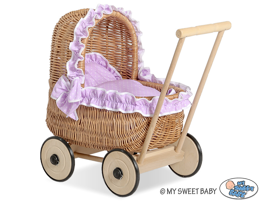 Luonnollisen väriset nuken vaunut punotulla korilla ja pehmusteilla Violetti Valkoisilla Pilkuilla