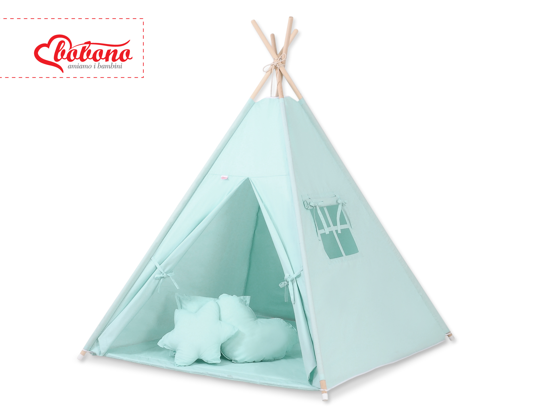 Settiin kuuluu tiipii-kangas, puupaalut, kiinnitysnaru, leikkimatto, 3-tyynyn setti, 2kpl koristehöyheniä.