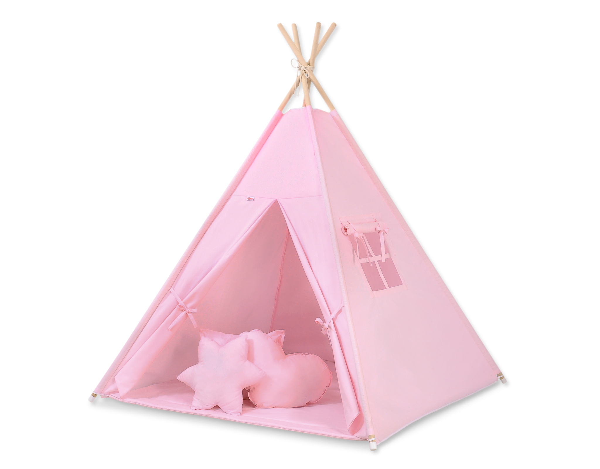 Settiin kuuluu tiipii-kangas, puupaalut, kiinnitysnaru, leikkimatto, 3-tyynyn setti, 2kpl koristehöyheniä.