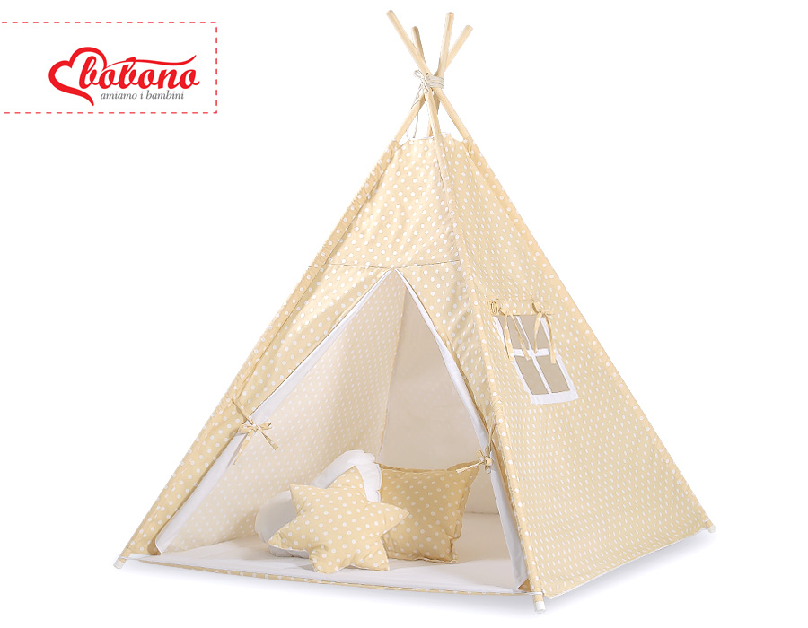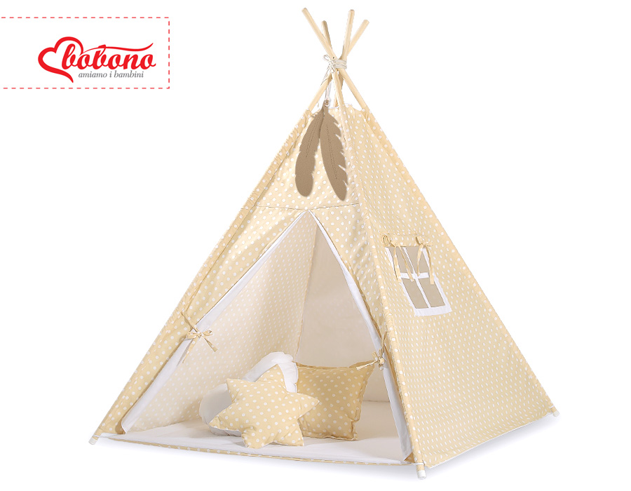 Minisetti: Lasten tiipii-teltta + leikkimatto + koristehöyhenet Beige Valkoisilla Pilkuilla