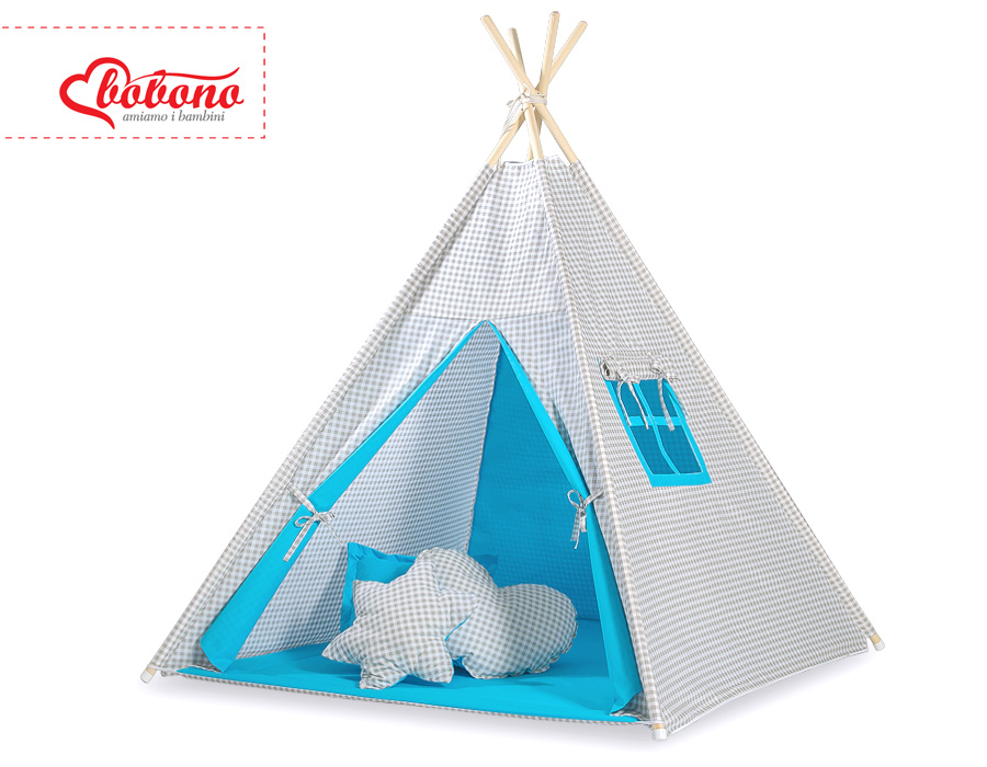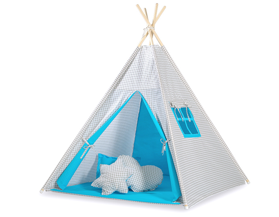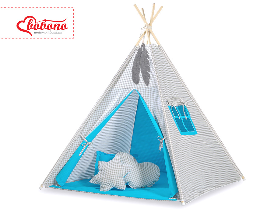 Minisetti: Lasten tiipii-teltta + leikkimatto + koristehöyhenet Harmaa Turkoosi Ruutukuvio