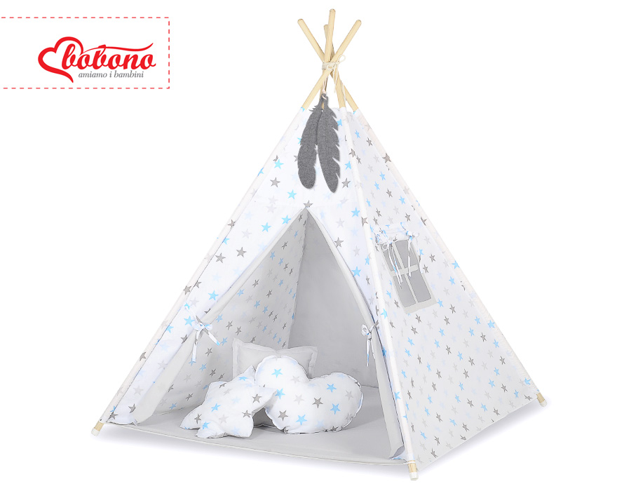 Settiin kuuluu tiipii-kangas, puupaalut, kiinnitysnaru, leikkimatto, 2kpl koristehöyheniä.