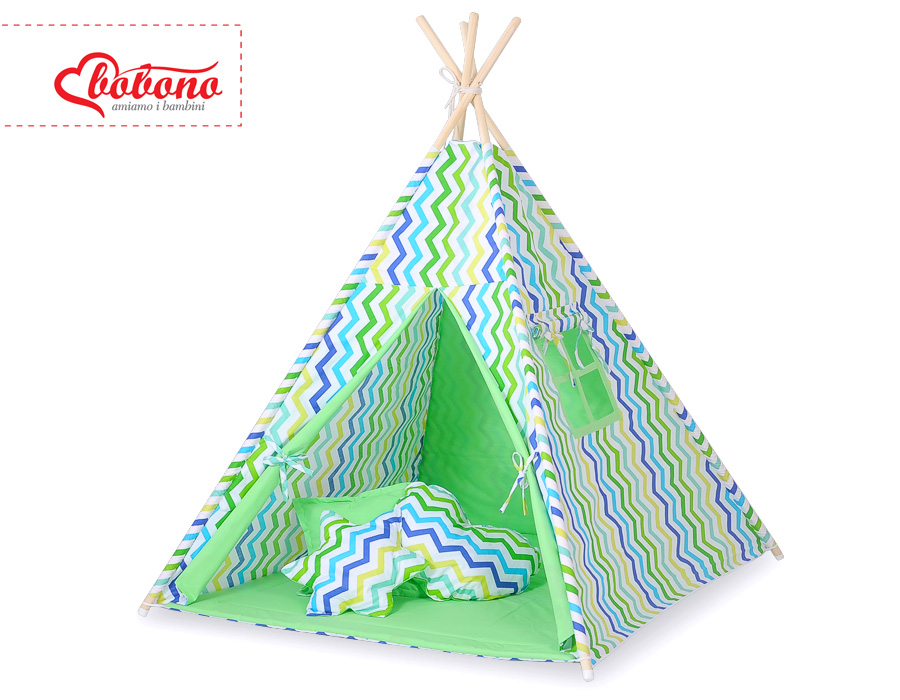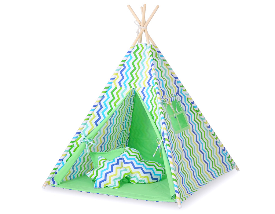 Minisetti: Lasten tiipii-teltta + leikkimatto + koristehöyhenet Vihreä Sininen Siksak