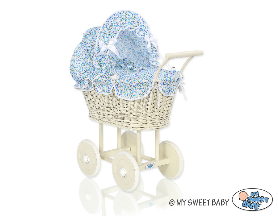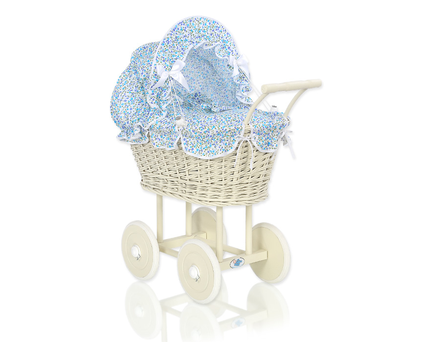 Etusivu » Lelut » Nukenvaunut » Punottu Nukenvaunut » Punottu Nukenvaunut Norsulu » Norsunluu vaunu punotulla korilla nukelle Norsunluu Sininen Kukkaketo Kukat