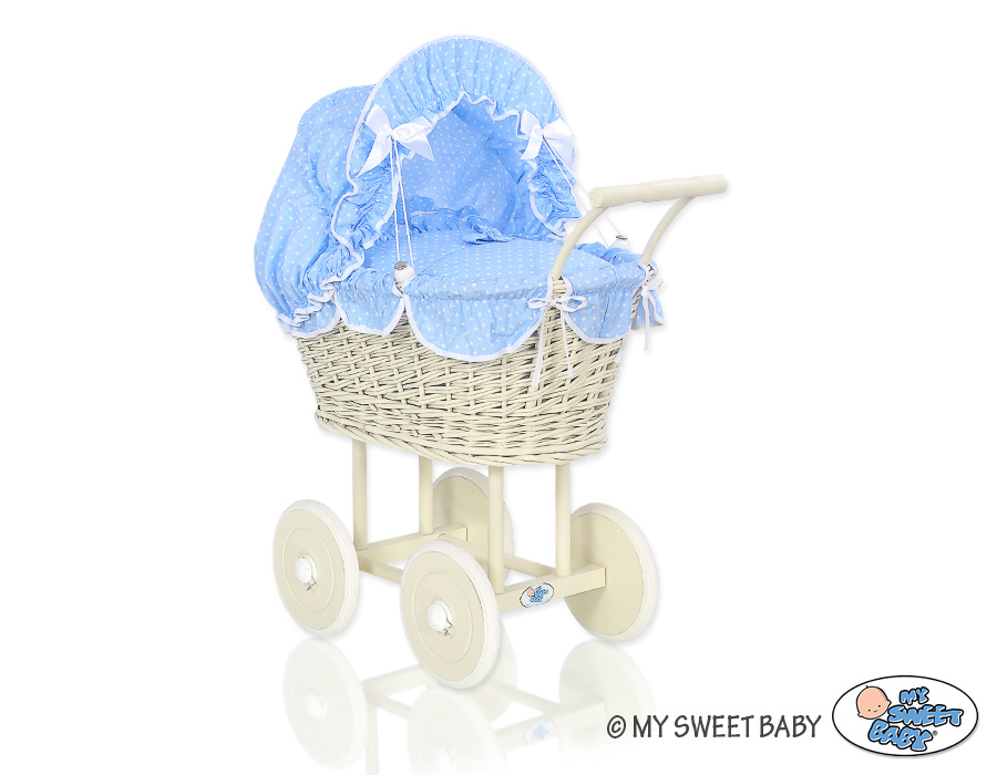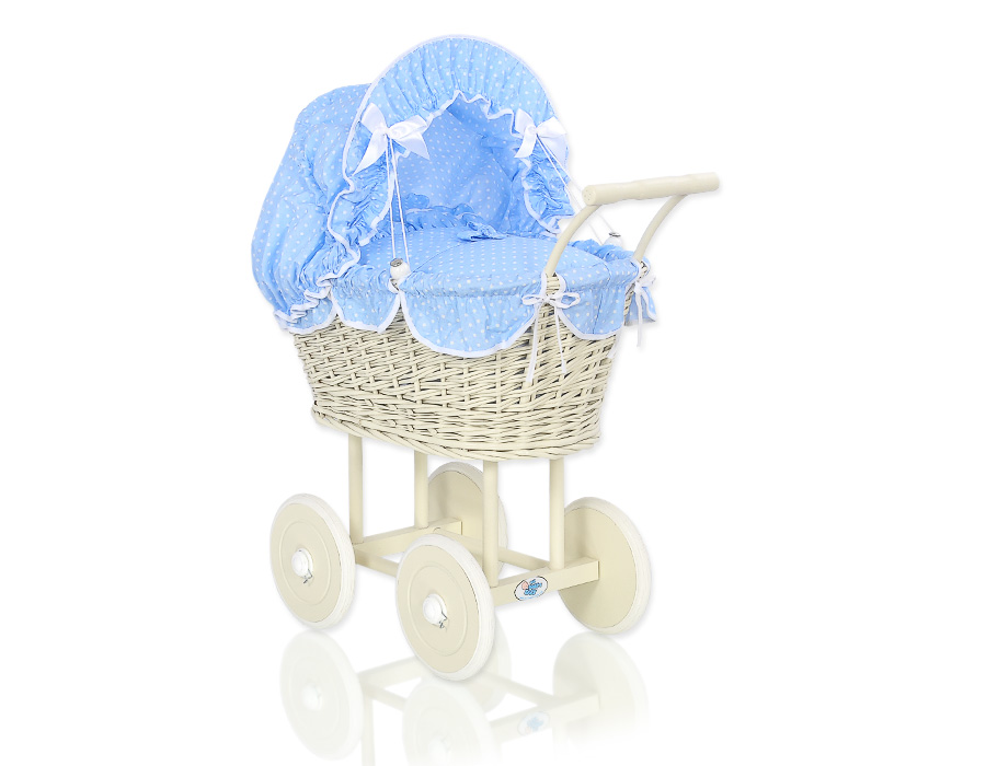 Etusivu » Lelut » Nukenvaunut » Punottu Nukenvaunut » Punottu Nukenvaunut Norsulu » Norsunluu vaunu punotulla korilla nukelle Norsunluu Valkoinen Sininen