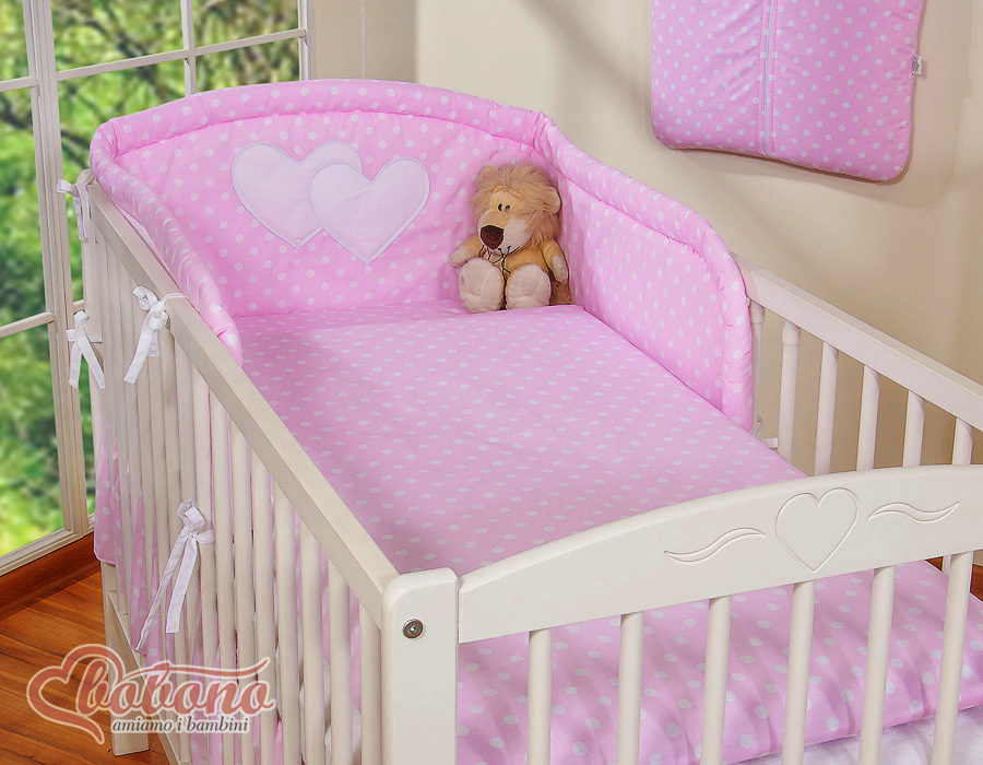 Mitat: Pituus 188cm, korkeus 35cm. Muotoon ommeltu. Sopii pinnasängyille (60x120cm ja 70x140cm). Pääosa kevyesti kaarrettu ja koristeltu tikatuilla tikatuilla sydämillä, muotoon ommeltu kauniilla satiinireunuksella. Erityinen muotoilu, vahvistettu ja paksunnettu yläreuna lisää pinnasänkyyn pehmeyttä ja turvallisuutta.