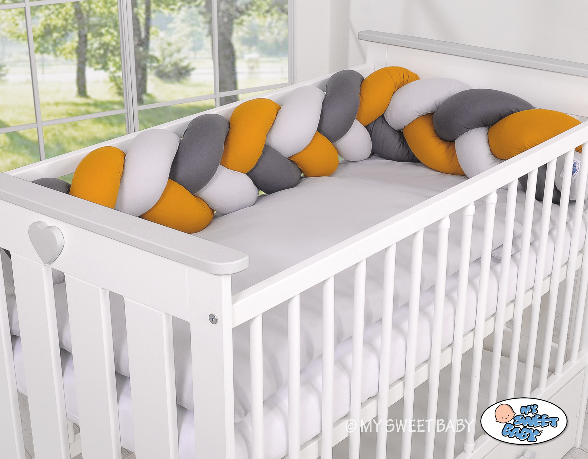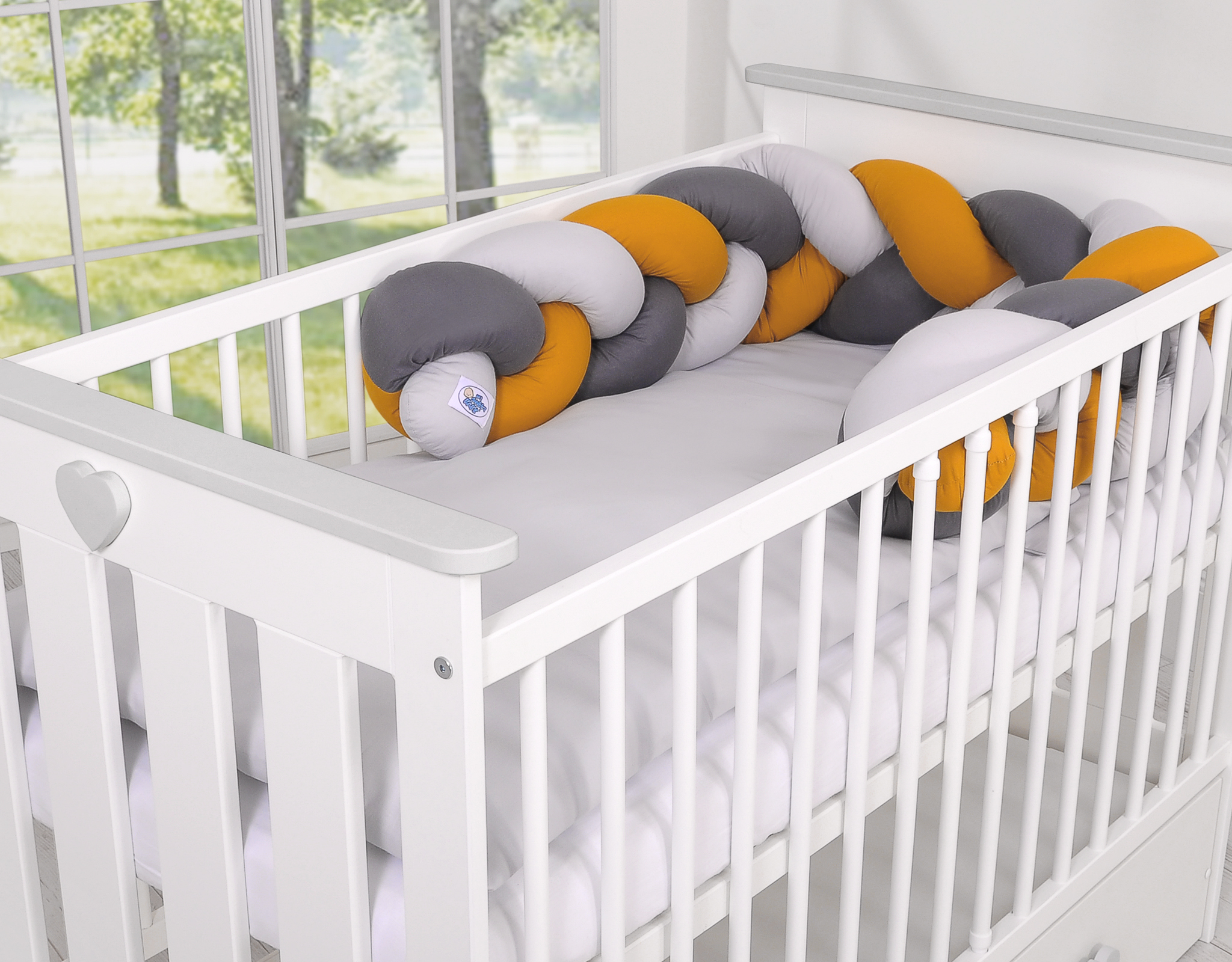 Mielenkiintoisen ja kauniin näköinen, pehmeä, letitetty reunapehmuste on 100% puuvillaa. Sen pystyy sitomaan pinnoihin kiinni.