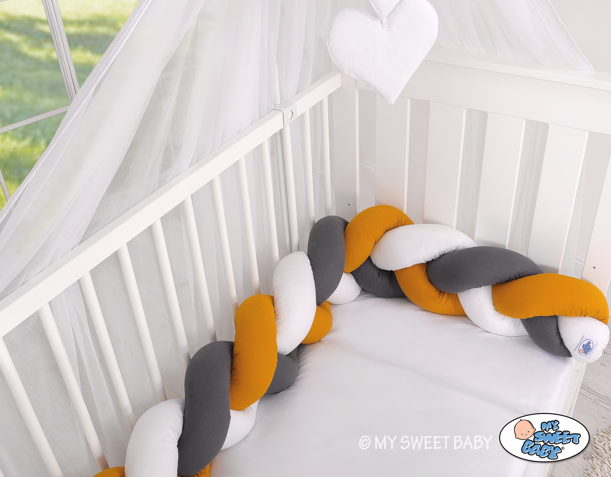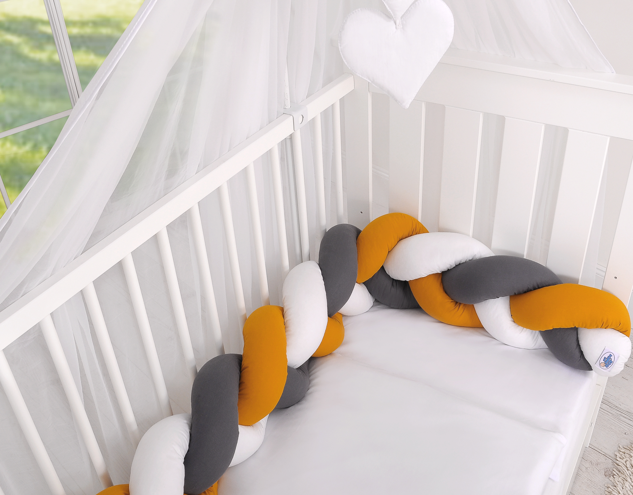 Mielenkiintoisen ja kauniin näköinen, pehmeä, letitetty reunapehmuste on 100% puuvillaa. Sen pystyy sitomaan pinnoihin kiinni.