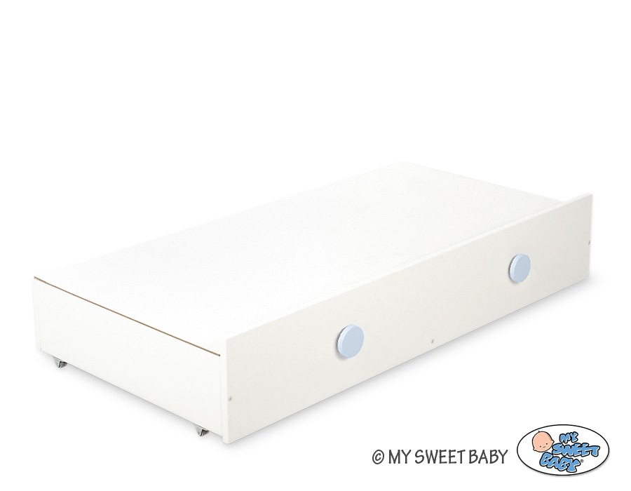 Vetolaatikko pinnasängyn alle (120x60cm) kauniilla käsityönä tehdyillä vetonupeilla. Säilytyslaatikko antaa lisää tilaa vauvan vuodevaatteille, leluille ja muille tarvikkeille, käden ulottuville.