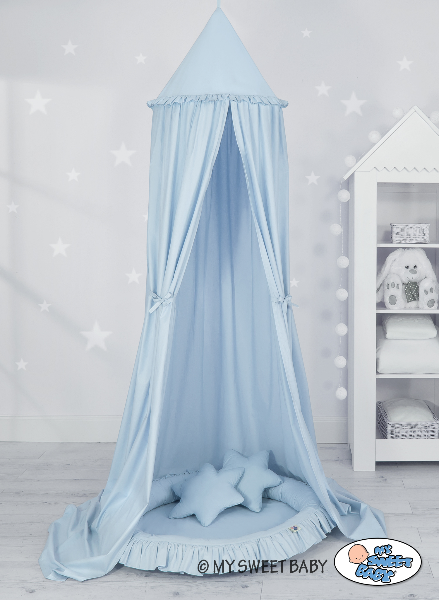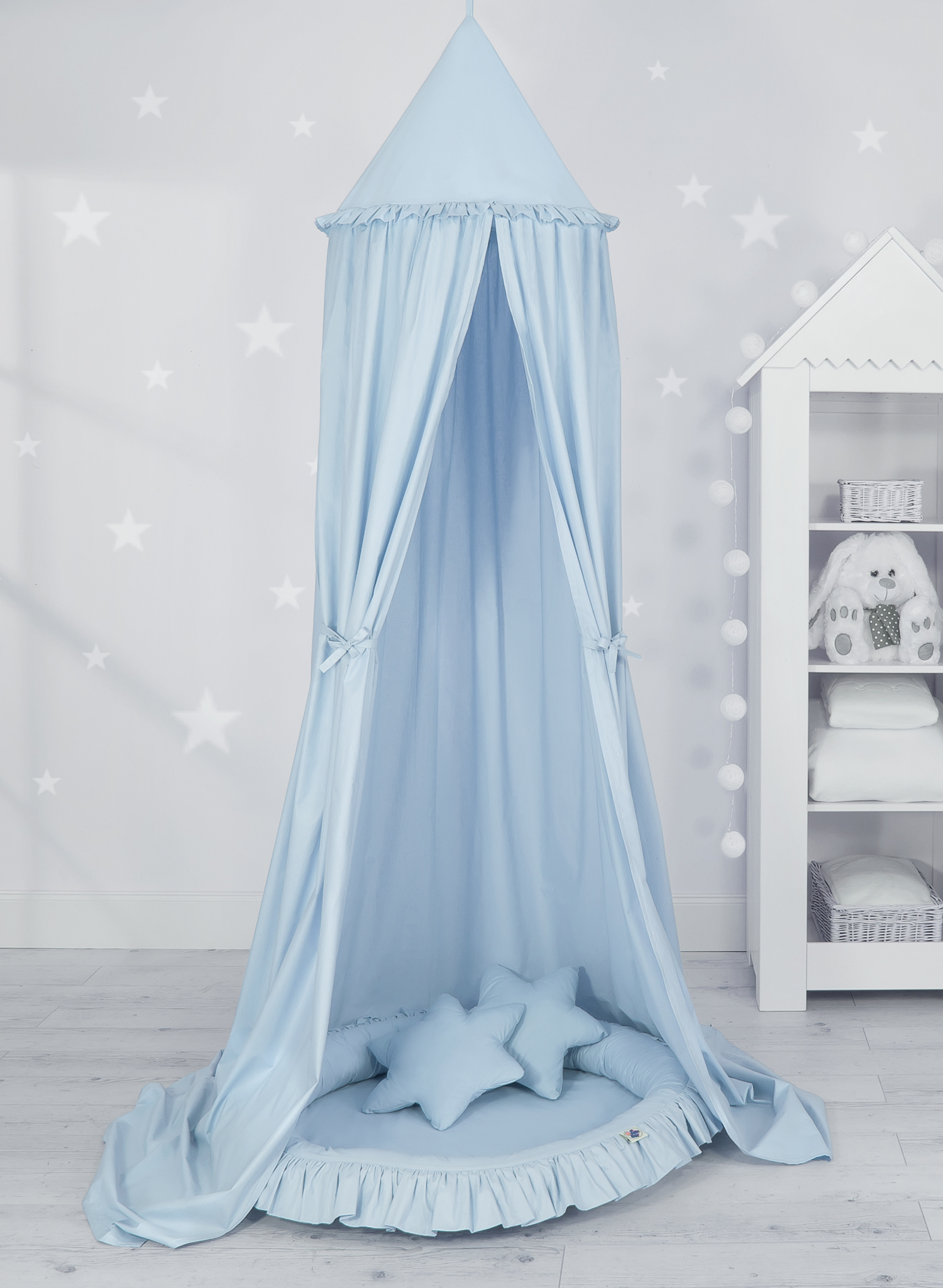 Etusivu » Vuodekatos » Setti: Vuodekatos + leikkipesä + tyynyt » Prinsessakatos-setti matolla ja tyynyillä Sininen
