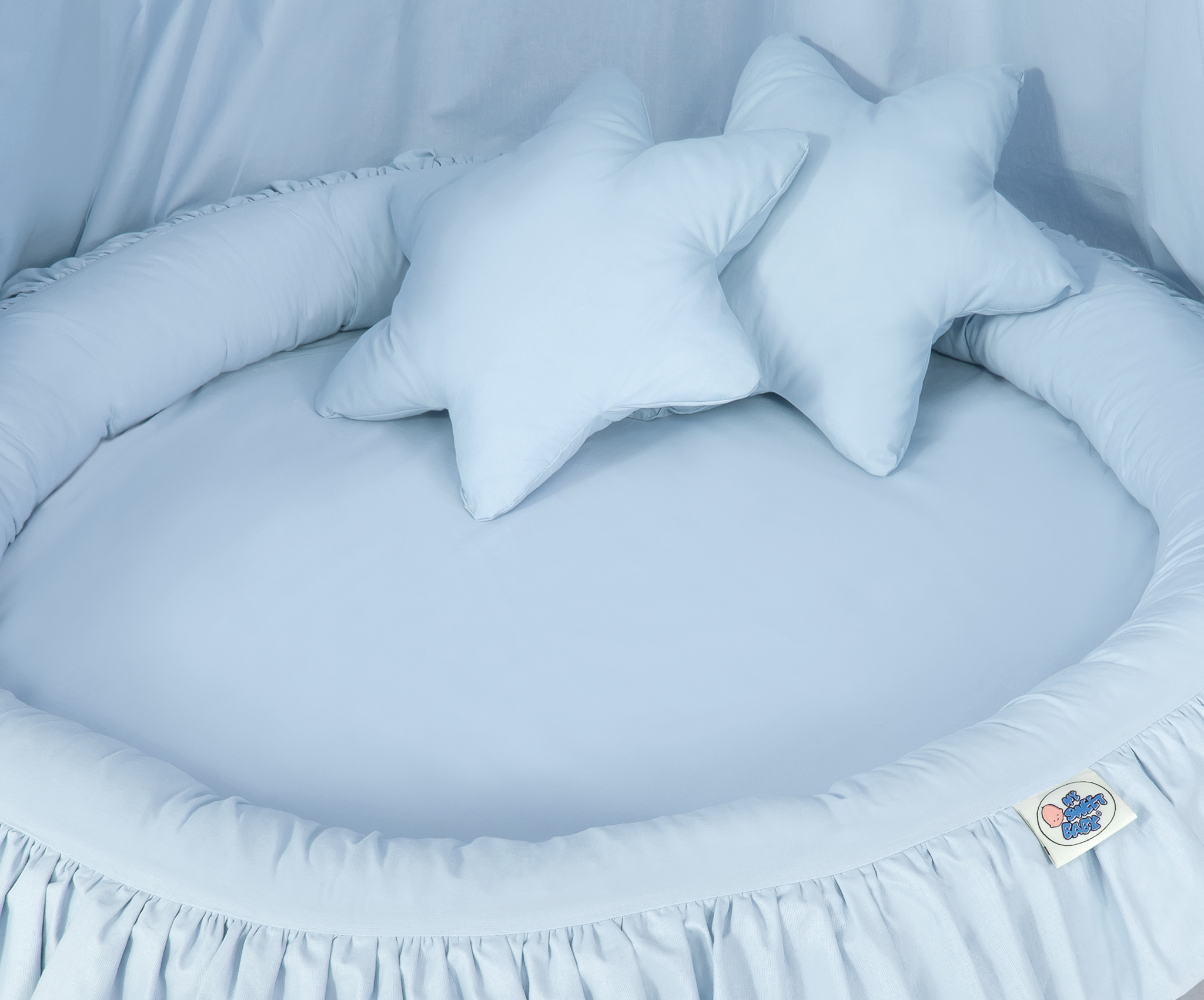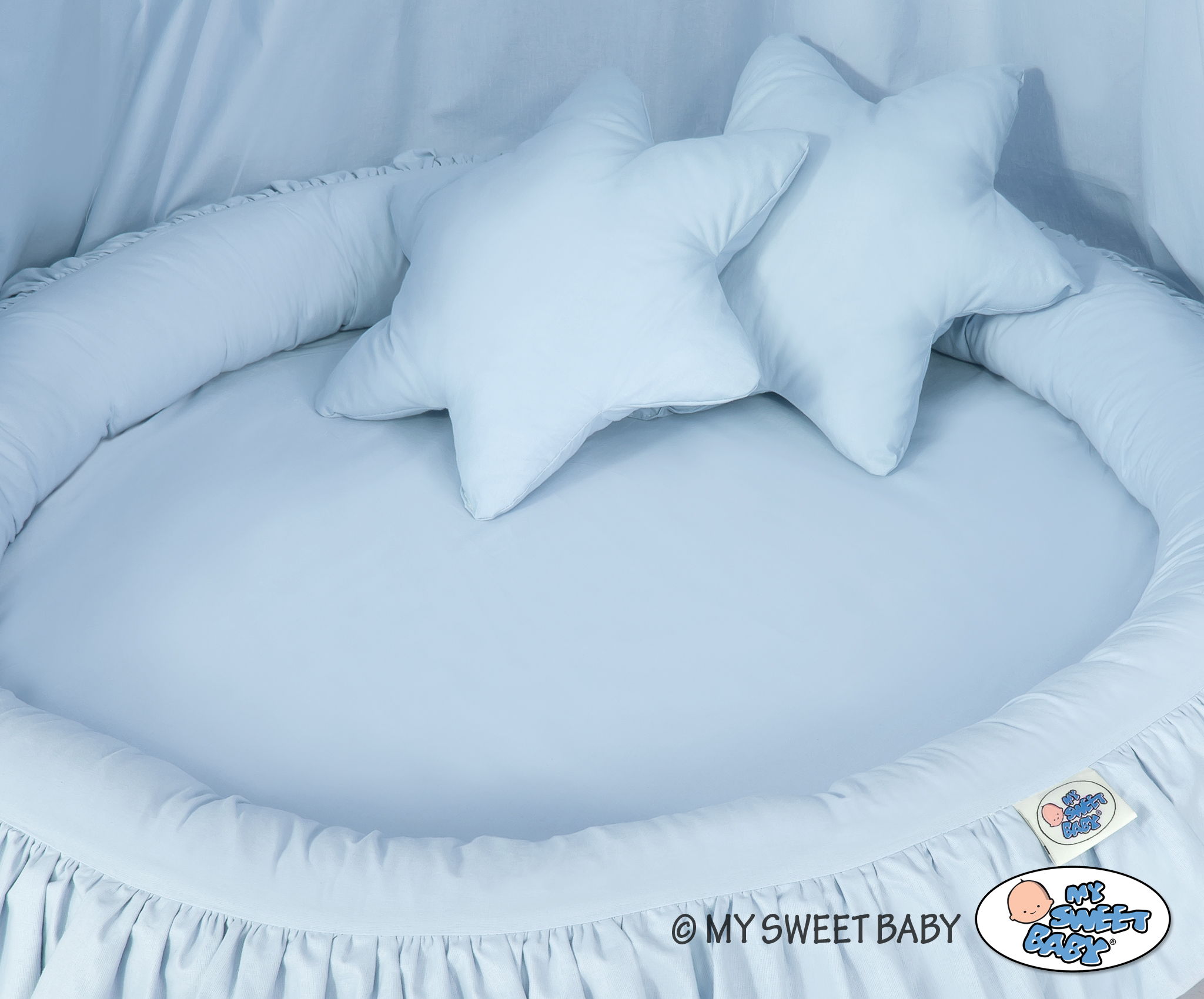 Setissä tulee mukana ihana pesä röyhelöreunuksella, joka on hauska ja jännittävä leikkipesä. Pehmeä reunus pitää vauvan turvallisesti reunojen sisäpuolella. Päällinen on 100% Okotex-sertifioitua puuvillaa. Reunus on täytetty hyväksytyllä, anti-allergisella eko-pallokuiduilla. Ne ovat pehmeitä, pitävät hyvin muotonsa ja varmistavat ilman kiertämisen. Patjan pohja myös valmistettu nykyaikaisista, anti-allergisista ja sertifioiduista raaka-aineista. Päällyksen saa irti patjasta pesua varten, pesu 30 asteessa.