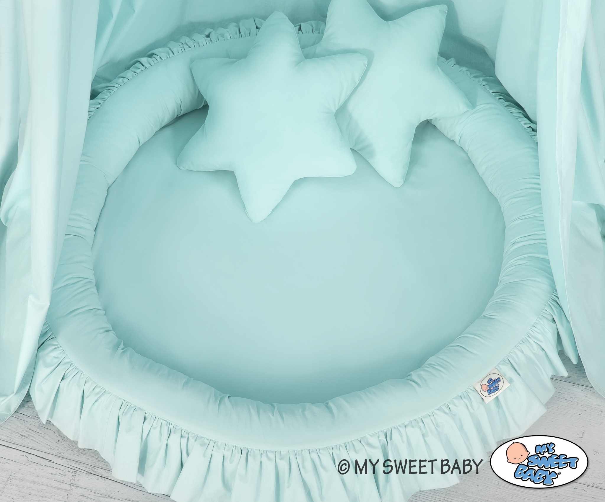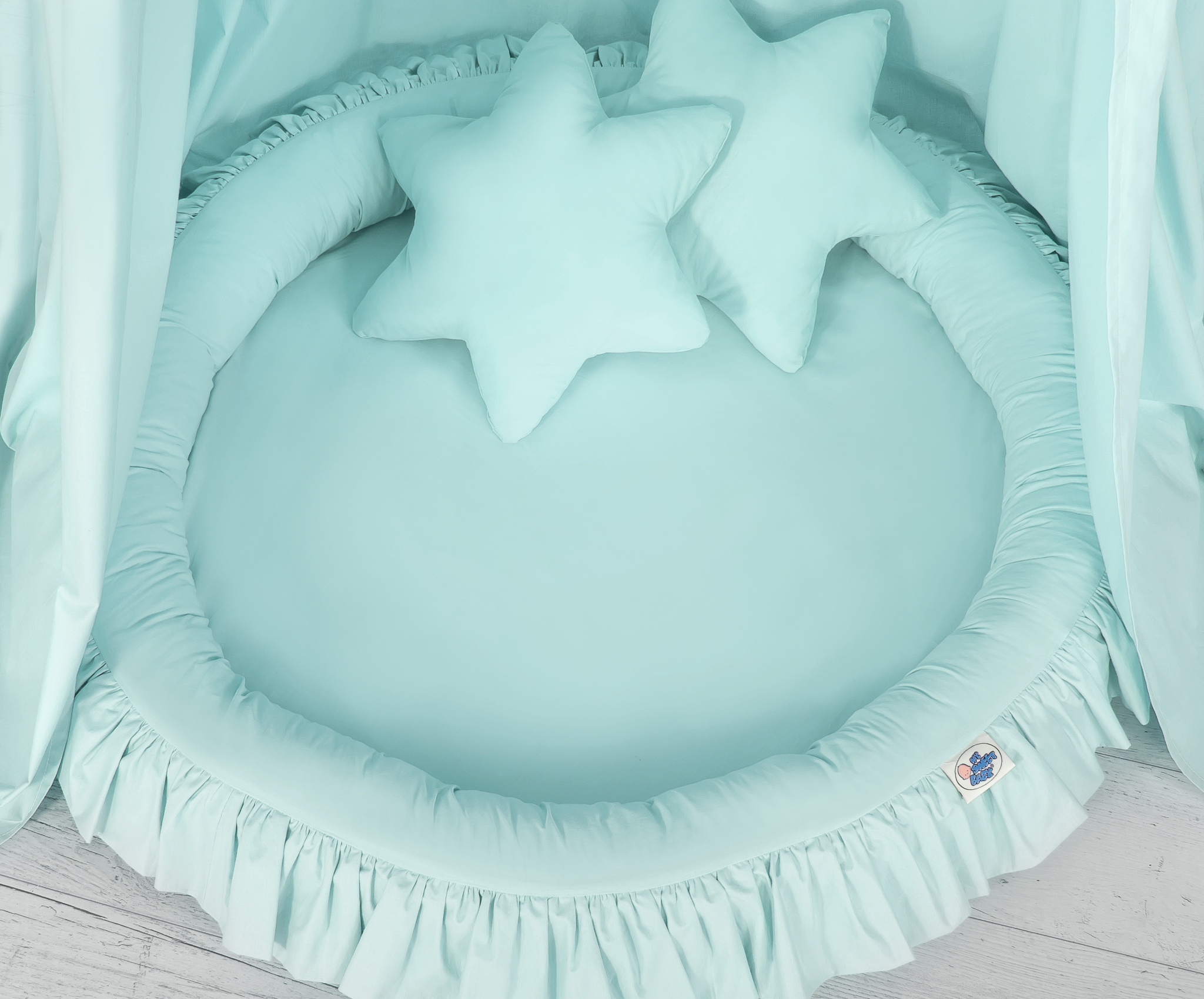 Setissä tulee mukana ihana pesä röyhelöreunuksella, joka on hauska ja jännittävä leikkipesä. Pehmeä reunus pitää vauvan turvallisesti reunojen sisäpuolella. Päällinen on 100% Okotex-sertifioitua puuvillaa. Reunus on täytetty hyväksytyllä, anti-allergisella eko-pallokuiduilla. Ne ovat pehmeitä, pitävät hyvin muotonsa ja varmistavat ilman kiertämisen. Patjan pohja myös valmistettu nykyaikaisista, anti-allergisista ja sertifioiduista raaka-aineista. Päällyksen saa irti patjasta pesua varten, pesu 30 asteessa.