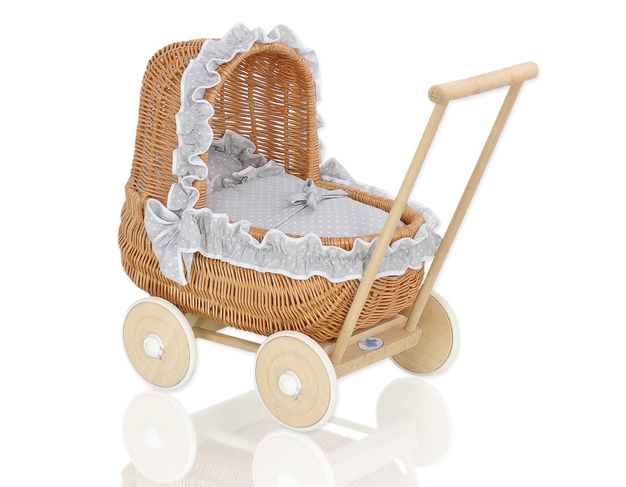 Puunväriset nuken vaunut punotulla korilla Valkoinen Harmaa Valkoisilla PilkuillaPuunväriset nuken vaunut punotulla korilla Valkoinen Harmaa Valkoisilla PilkuillaPuunväriset nuken vaunut punotulla korilla Valkoinen Harmaa Valkoisilla Pilkuilla