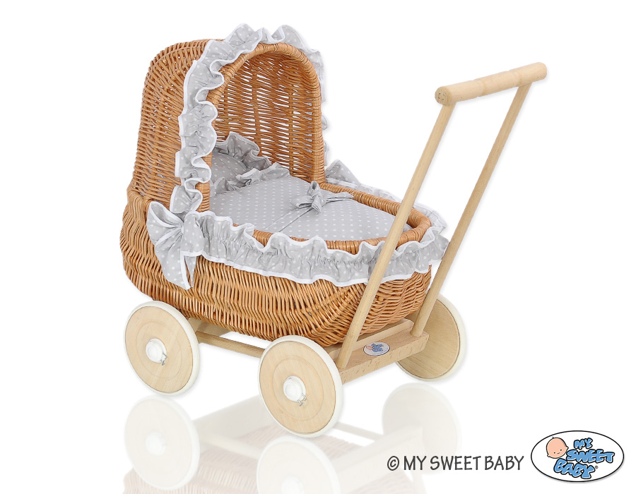 Etusivu » Lelut » Nukenvaunut » Punottu Nukenvaunut » Nukenvaunut koripunosta » Puunväriset nuken vaunut punotulla korilla Valkoinen Harmaa Valkoisilla Pilkuilla