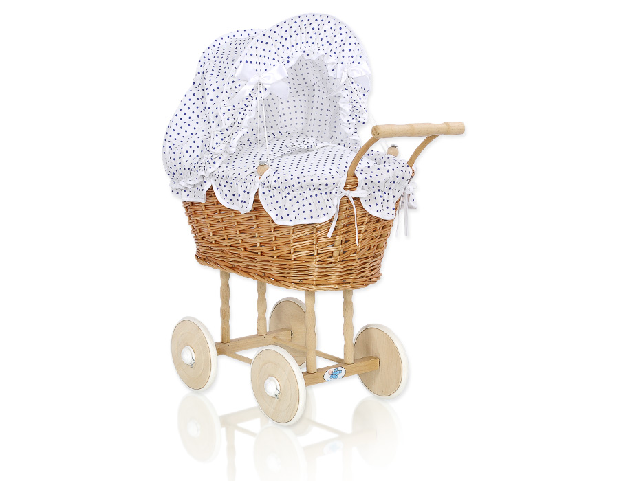 Etusivu » Lelut » Nukenvaunut » Punottu Nukenvaunut » Nukenvaunut koripunosta » Puunväriset nuken vaunut punotulla korilla Valkoinen Laivastonsininen Valkoisilla Pilkuilla